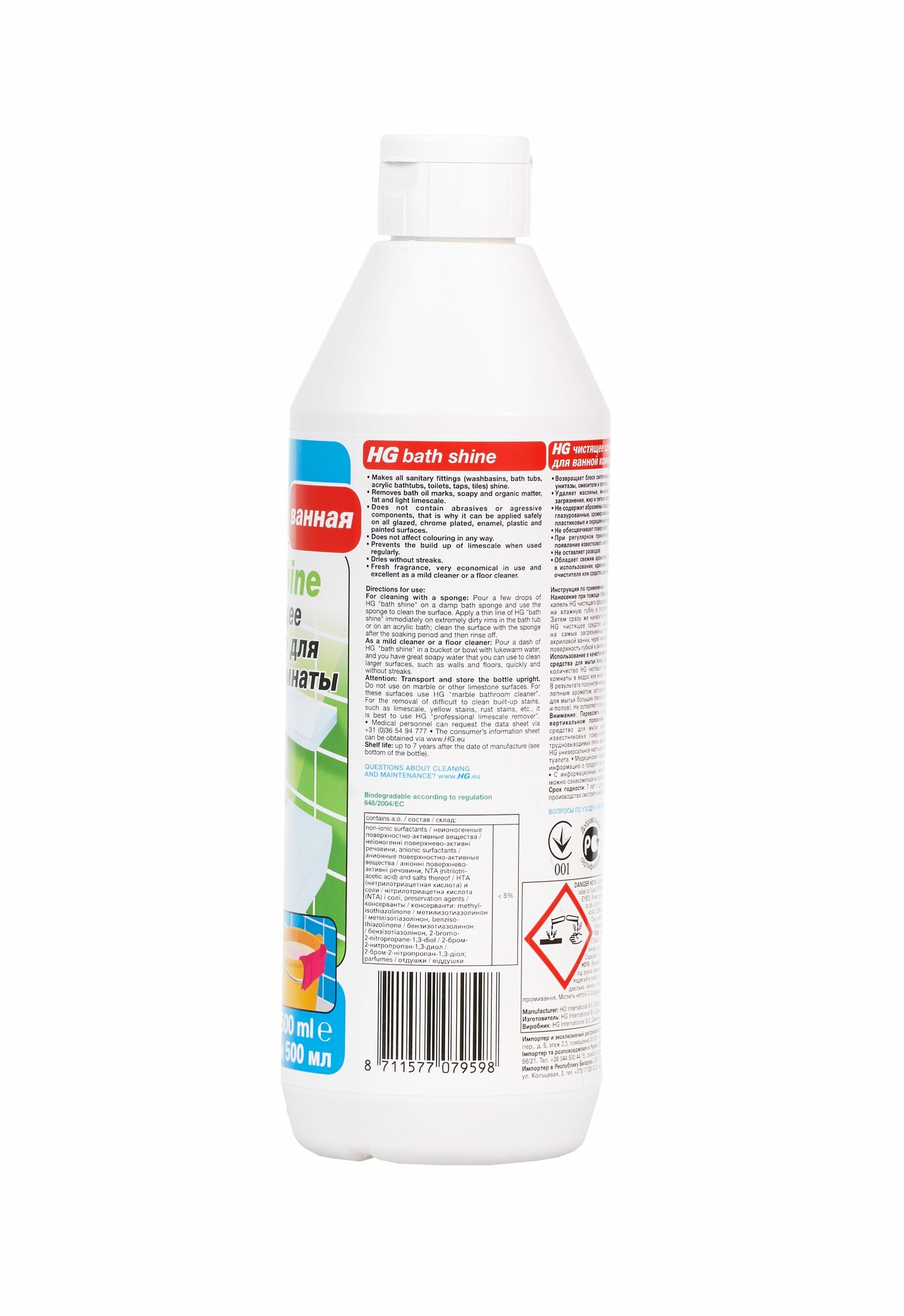 Поддерживающая уборка ванной комнаты — это не обязательно жесткие химикаты и отдельные бутылочки для каждого вида сантехники. Вам понадобится лишь одно универсальное чистящее средство от HG, чтобы каждый уголок ванной снова стал безупречным. Когда чистота — не иллюзия Средство для ванной комнаты HG — это гигиенический очиститель, который заботится о санитарном состоянии сантехники и помещения. - Подходит для чистки ванн, раковин, унитаза, кранов, плитки, кафеля. - Придает поверхностям сияние. - Быстро и тщательно удаляет пятна от мыла, косметических средства, масла, жира, а также — легкий слой известкового налета. - Не оставляет разводов. - Обладает свежим, не едким ароматом. - Не содержит абразивных компонентов и подходит для хрома, эмали, пластика и окрашенных поверхностей. - Предупреждает появление известкового налета при регулярном использовании. - Экономично расходуется благодаря концентрированной консистенции густого геля. Бережный состав Средство содержит неионогенные ПАВ. Эта категория поверхностно-активных веществ считается самой безопасной: они гипоаллергенны и биоразлагаемы. Качество из Нидерландов HG — один из известнейших брендов в мире, один из лидеров европейского рынка в сфере ухода за домом. Его почти 50-летняя история началась в Нидерландах. HG специализируется на производстве концентрированных средств для интенсивной, качественной и быстрой уборки без стресса и вреда.
