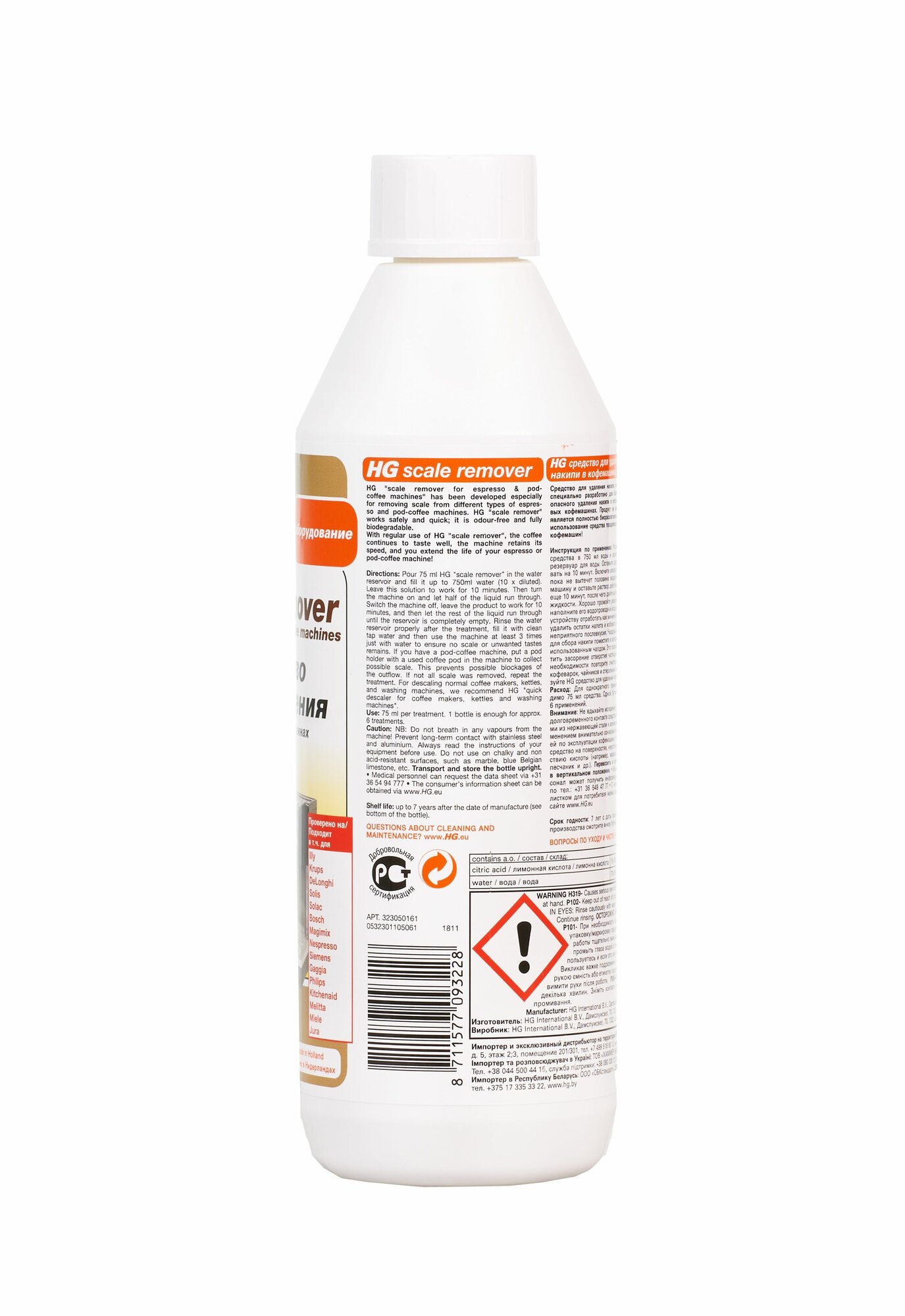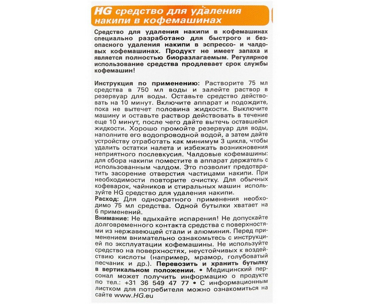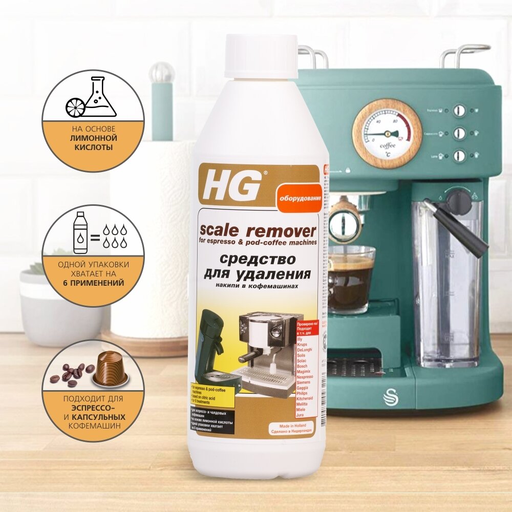 Средство HG для удаления накипи в кофемашинах специально разработано для быстрого и безопасного удаления накипи в эспрессо и капсульных кофемашинах. Продукт не имеет запаха и является полностью биоразлагаемым. При регулярном использовании средства ваша кофемашина прослужит много лет, а кофе всегда будет вкусным!