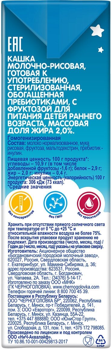 Питьевая молочно-рисовая кашка «Черноголовка Бэйби» полностью готова к употреблению и не требует специальных условий хранения. Содержит пребиотики, которые помогают пищеварению, и злаки, которые способствуют насыщению. Удобно взять с собой на прогулку, в поездку или на пикник. А изображения героев любимого мультсериала «Оранжевая корова» развлекут и порадуют малыша.