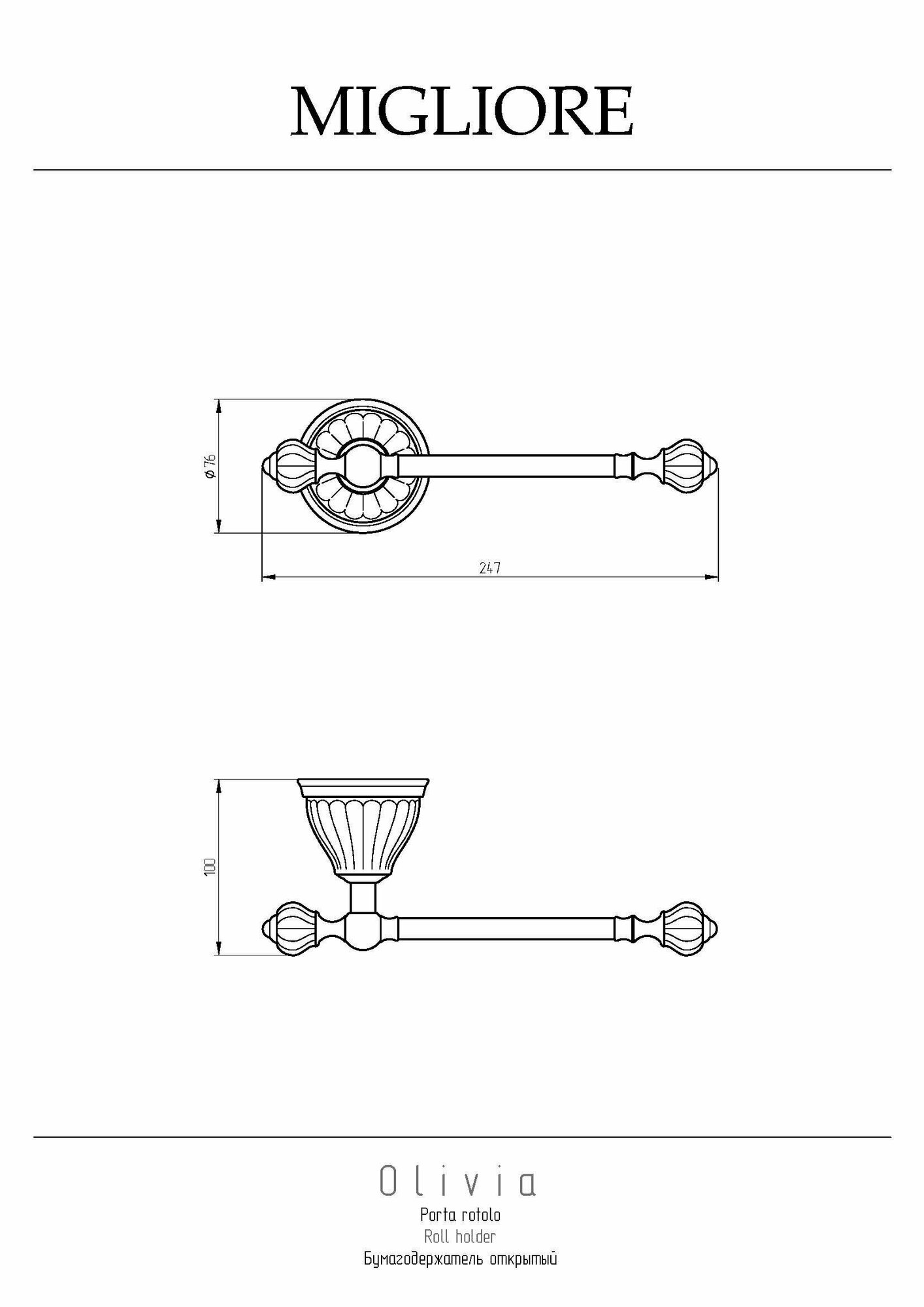 Бумагодержатель коллекции OLIVIA бренда MIGLIORE — это один из необходимых аксессуаров для ванной комнаты. Вы также можете повесить его вертикально и использовать его в качестве держателя для запасного рулона.Материал — латунь, покрытие цвета бронза. Внимание: бронзовое покрытие достаточно деликатное и для ухода рекомендуется протирать изделие мягкой безворсовой тряпочкой с мыльным раствором и вытирать насухо или использовать чистящее средство бренда MIGLIORE для смесителей и аксессуаров с деликатными покрытиями бронза, золото, медь.Материал: Латунь+керамикаОснащение: крепления (шурупы)
