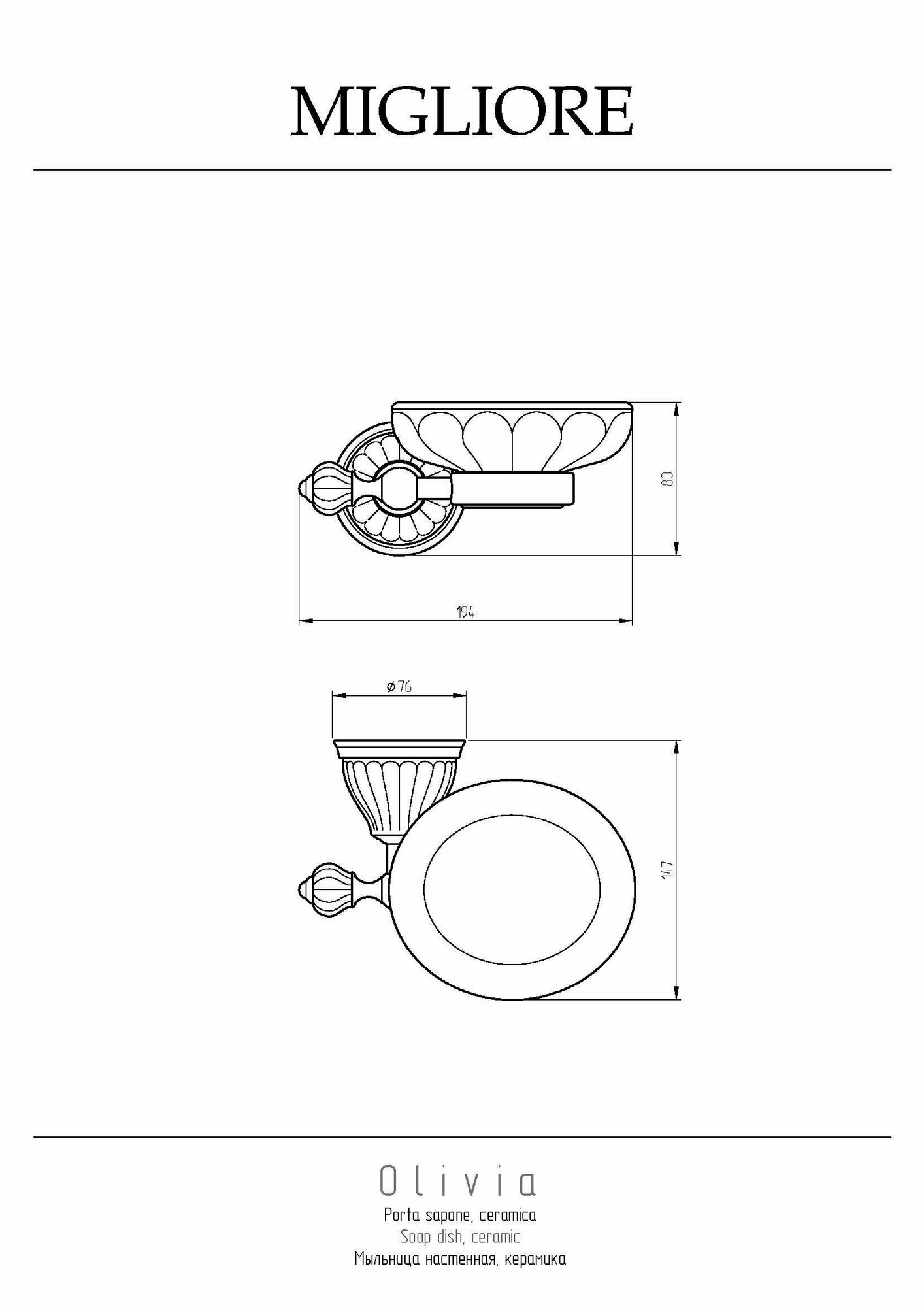 Мыльница настенная коллекции OLIVIA бренда MIGLIORE - один из необходимых аксессуаров для ванной комнаты. Качественная белая керамика, которую очень легко мыть. Изделие выполнено из высококачественной латуни и имеет гальваническое покрытие золотом 24 карата. Внимание: золотое покрытие очень деликатное и для ухода рекомендуется использовать чистящее средство бренда MIGLIORE для смесителей и аксессуаров с деликатными покрытиями бронза, золото, медь и протирать мягкой ветошью. Материал: Латунь+керамика Оснащение: крепления (шурупы)