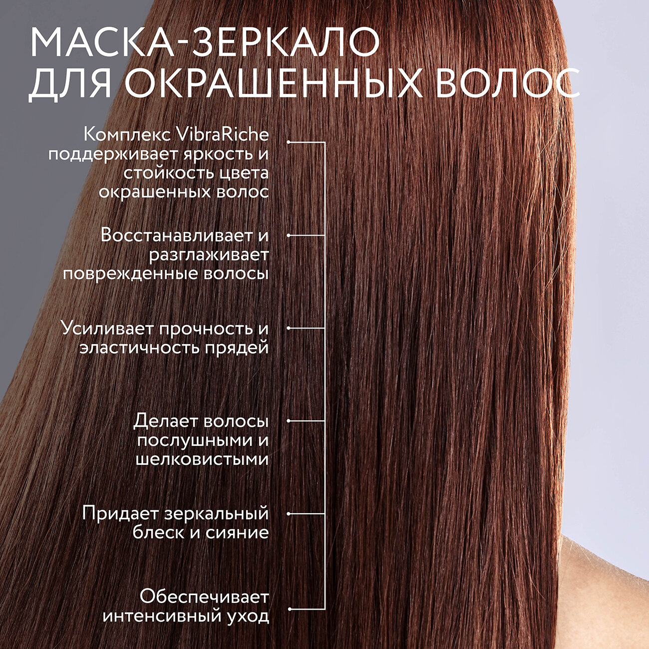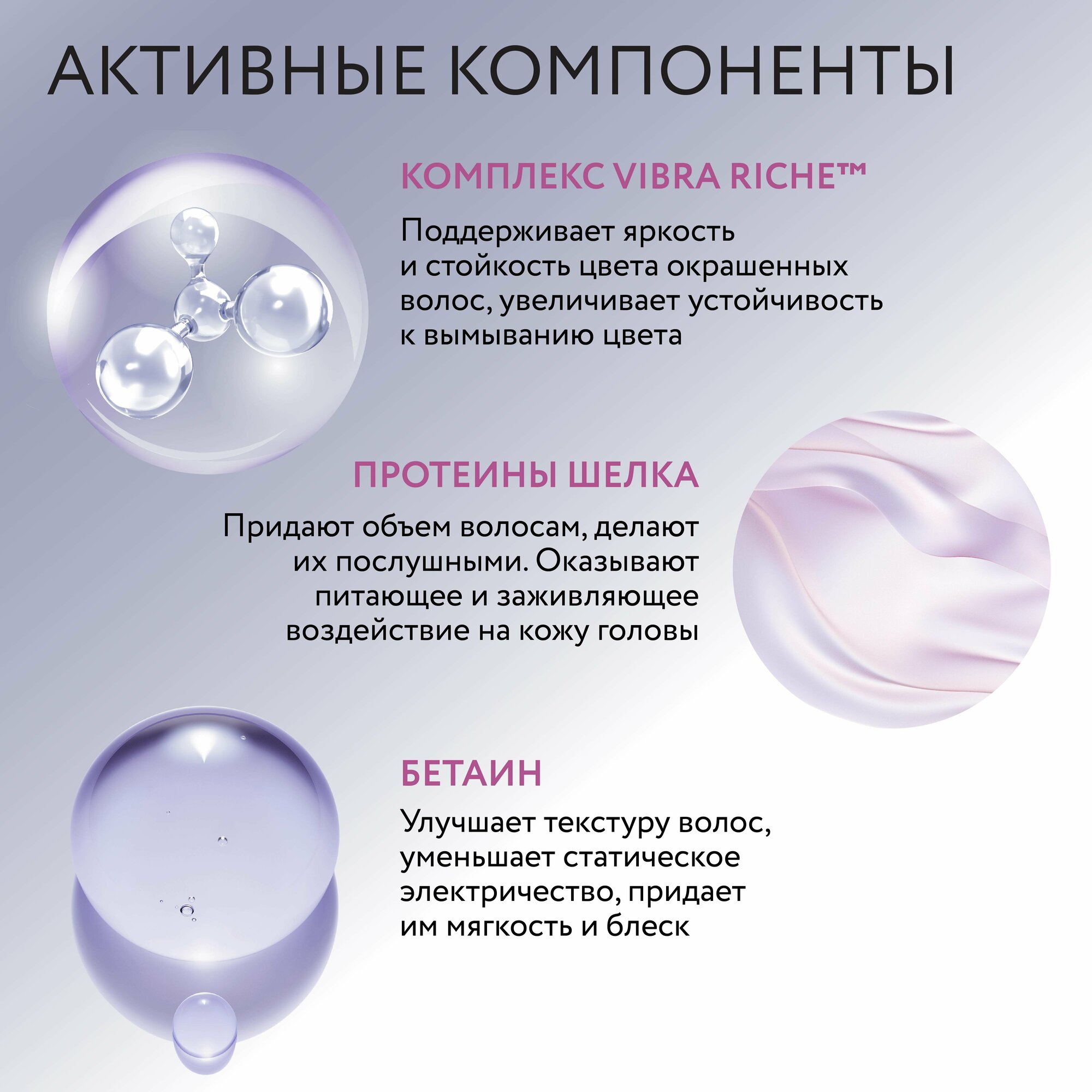 Регулярное использование позволяет восстановить поврежденные волосы, усилить их прочность и эластичность. Комплекс VibraRiche поддерживает яркость и стойкость цвета окрашенных волос.