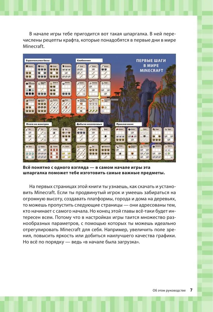 Полезное руководство для всех начинающих майнкрафтеров. Из него ты узнаешь, как пережить первую, самую опасную ночь, затем научишься делать своими руками всё, что может пригодиться для комфортной жизни в игровом мире. Откроешь для себя бескрайние просторы, познакомишься с разнообразными биомами и даже научишься творить волшебство. И точно так же, продвигаясь вперед, ты будешь постепенно улучшать свою игру и принимать более сложные решения.