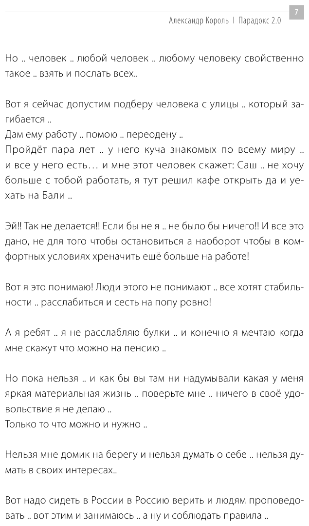 Александр Король - мой любимый автор. Книга Парадокс 2.0 одна из тех, что трезвит и заставляет по-другому взглянуть на свою жизнь, оценить разные ситуации под другим углом, сделать открытия для себя. Купив книгу, раскрыла наугад, попала на главу "Скучная работа и брак надоел" - удивительно, как автор всё описывает, будто читал мои мысли. О том, что работа надоедает и кажется скучной, что ты неудовлетворен, и хочешь всё разрушить. Но проблема не в этом, говорит Александр Король, а в том, что твоя жизнь скучная, и ты начинаешь искать проблему в работе, в семье и т.д., хотя на самом деле проблема в тебе. Одним словом, каждый может увидеть в этой книге свои "больные места" и поразмышлять.