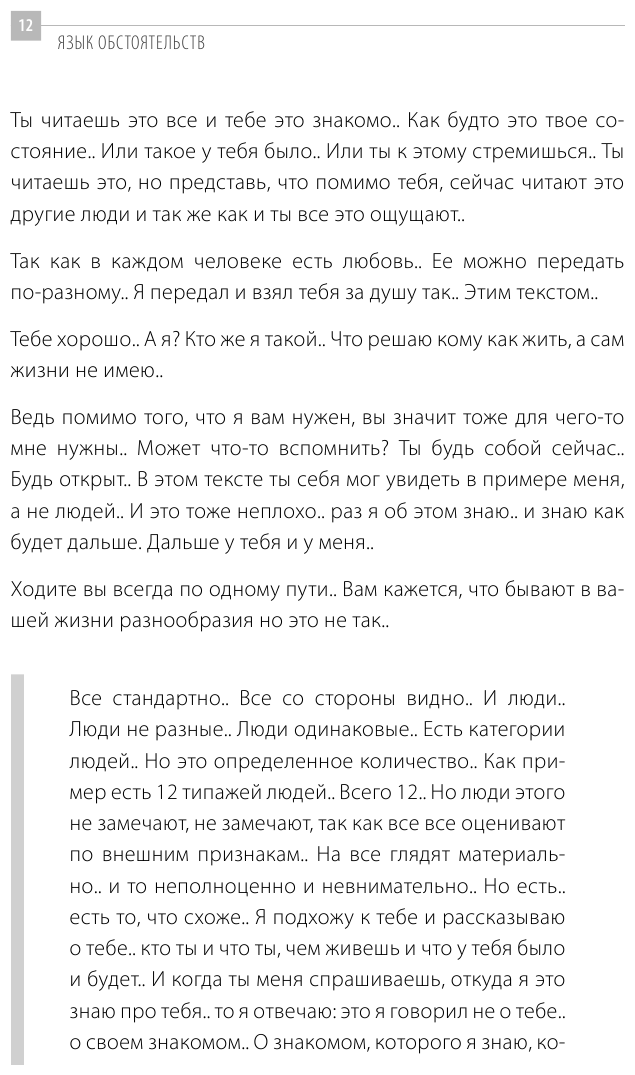 Книга довольно необычная, автор высказывает собственное мнение и ощущения так как испытал их. Кто-то может и не согласиться с ним, но кто-то и согласен. Она читается легко, но если вы хотите смысла и высокопарных фраз, то не сюда. Автор выражается очень просто, стараясь донести свое мнение до максимально широкой аудитории. Не забывайте, книга эта часть его философии.