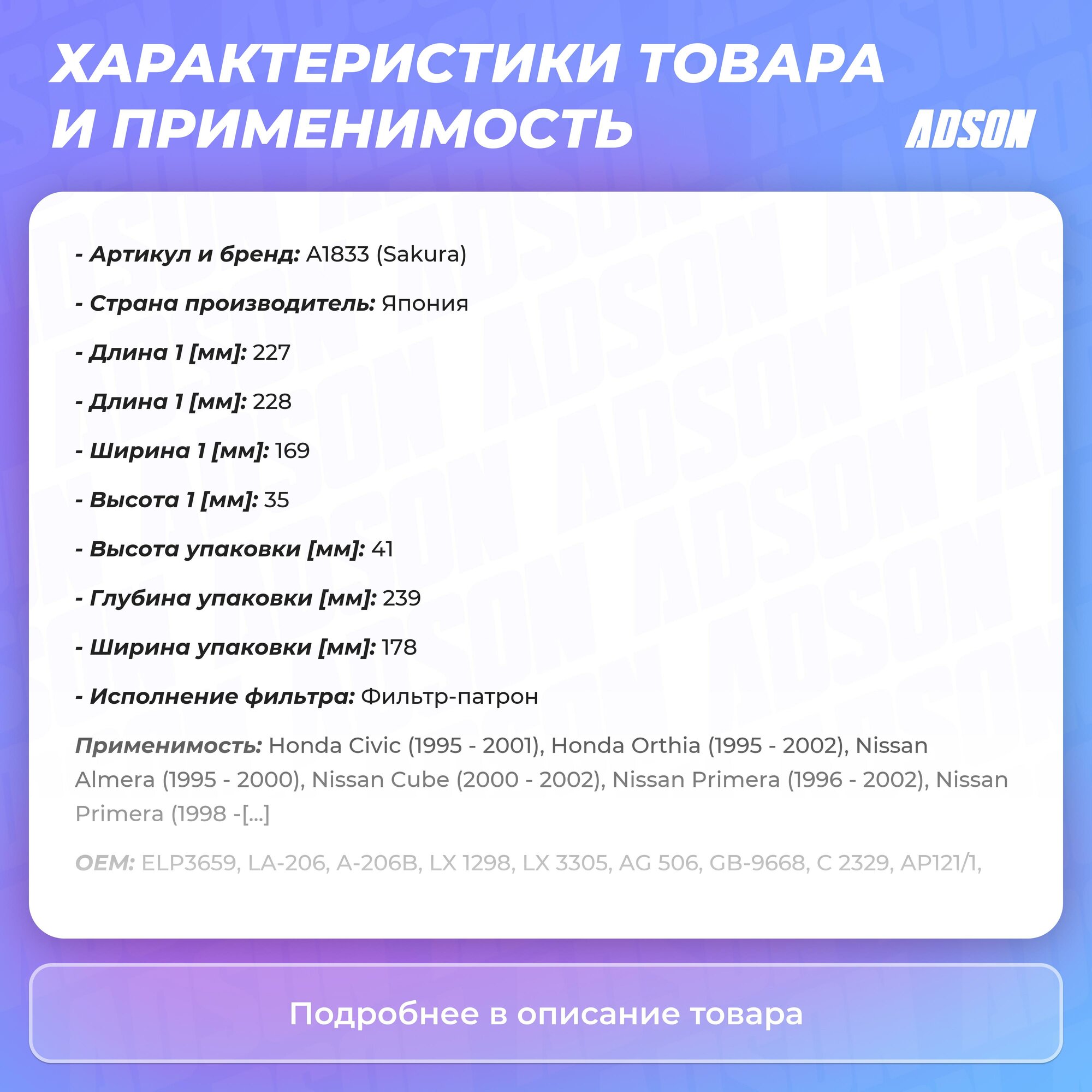 Тип товара: Фильтры автомобильные