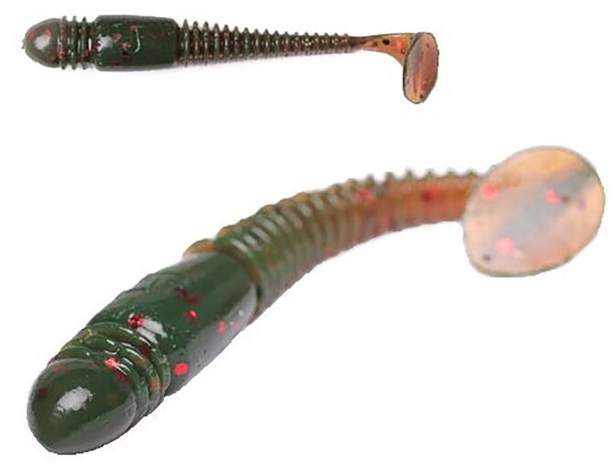 Круглая средних размеров пяточка на тонком плоском хвостике обеспечивает модели Tioga 62 интенсивную дразнящую игру. Большую подвижность и естественность при проводке виброхвосту придает поперечное глубокое рифление на теле. Ребристая поверхность создает и дополнительные вибрации при проводке.