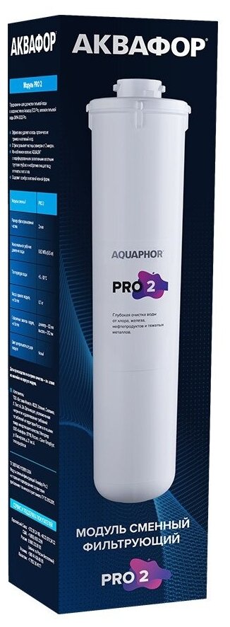 Модуль Pro 2 удаляет из воды даже небольшие концентрации химических примесей благодаря карбонблоку с ионообменным волокном Аквален. Картридж не пропускает частицы размером от 2 микрон и удаляет активный хлор, хлороформ, органические соединения, свинец, кобальт, железо, фенол, диоксины.