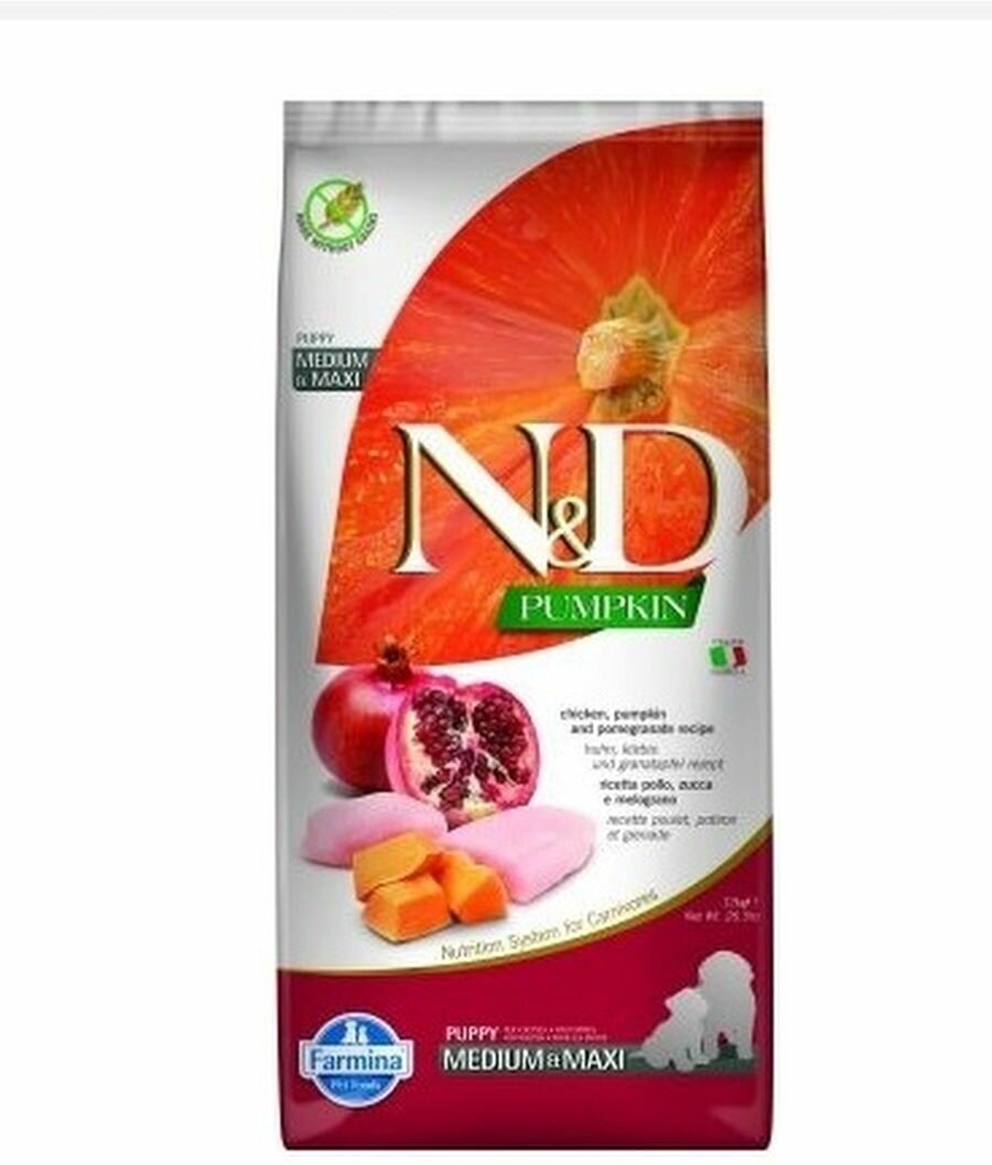 Farmina N&D Pumpkin Puppy Medium & Maxi беззерновой с курицей, тыквой и гранатом - беззерновой сухой корм с курицей, тыквой и гранатом. Предназначен для питания щенков средних и крупных пород.