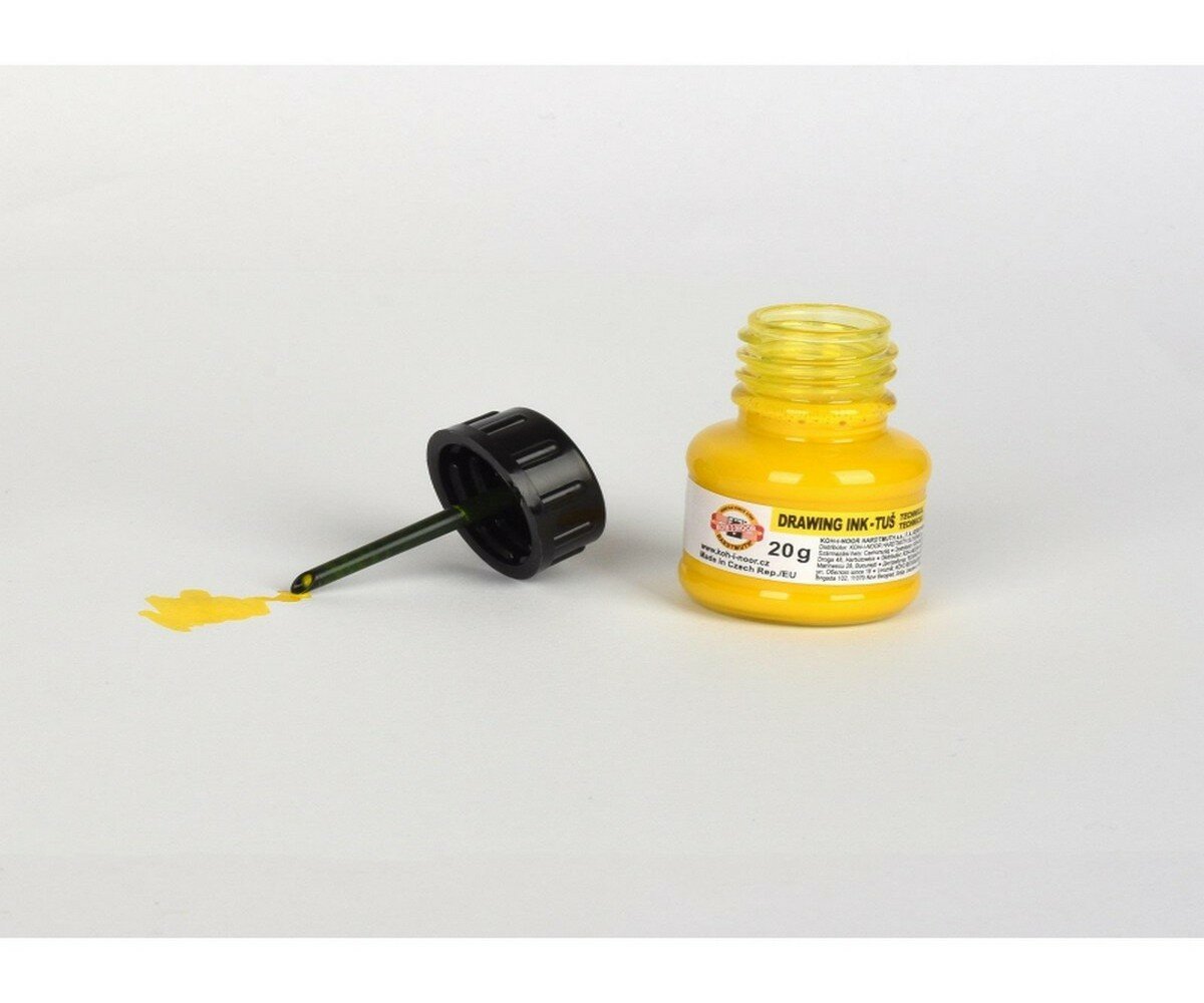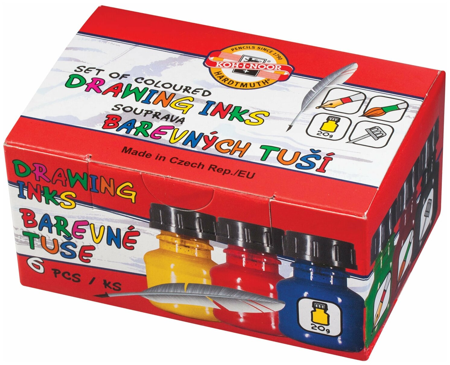 Тушь Koh-I-Noor акриловая на водной основе. Не засохшая тушь смывается водой, но при высыхании образует прочную водоустойчивую пленку. Туши разных цветов хорошо смешиваются между собой. В крышку флакона встроена специальная палочка для нанесения туши. Предназначена для письма и рисования на бумаге и картоне кистью или пером. Перед использованием тушь следует тщательно взболтать.