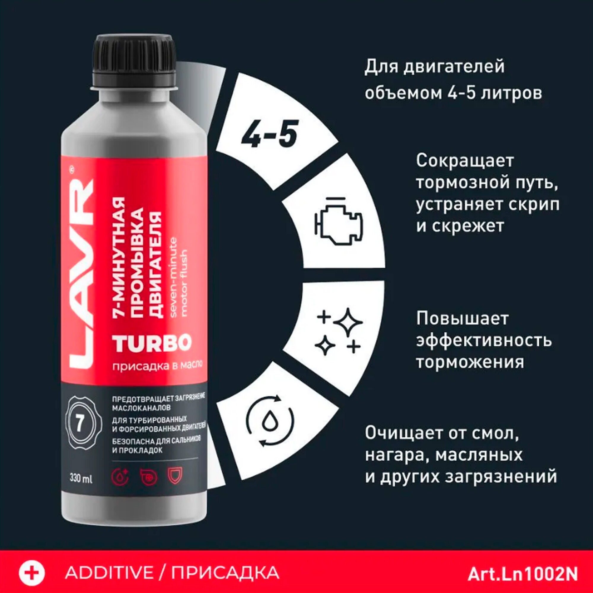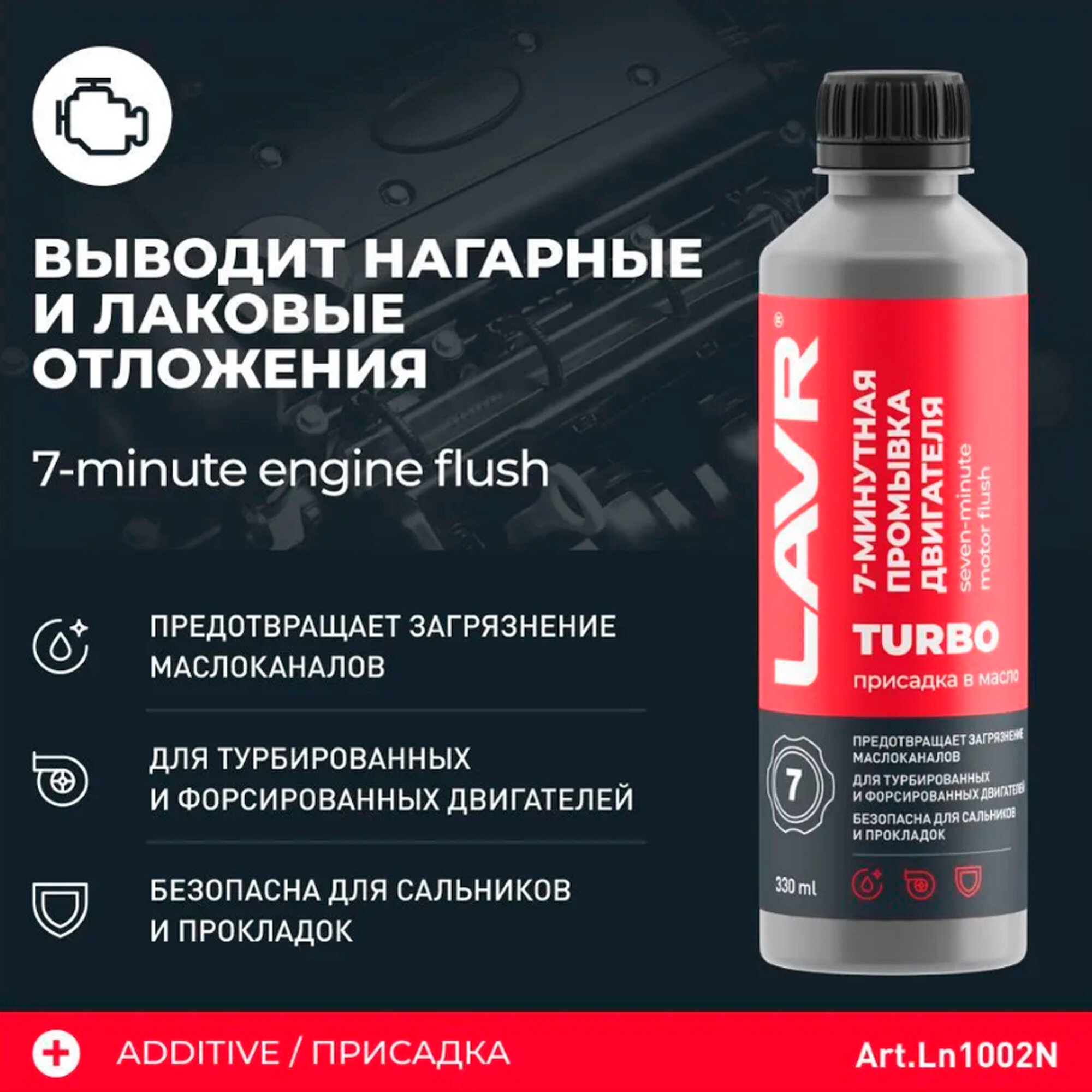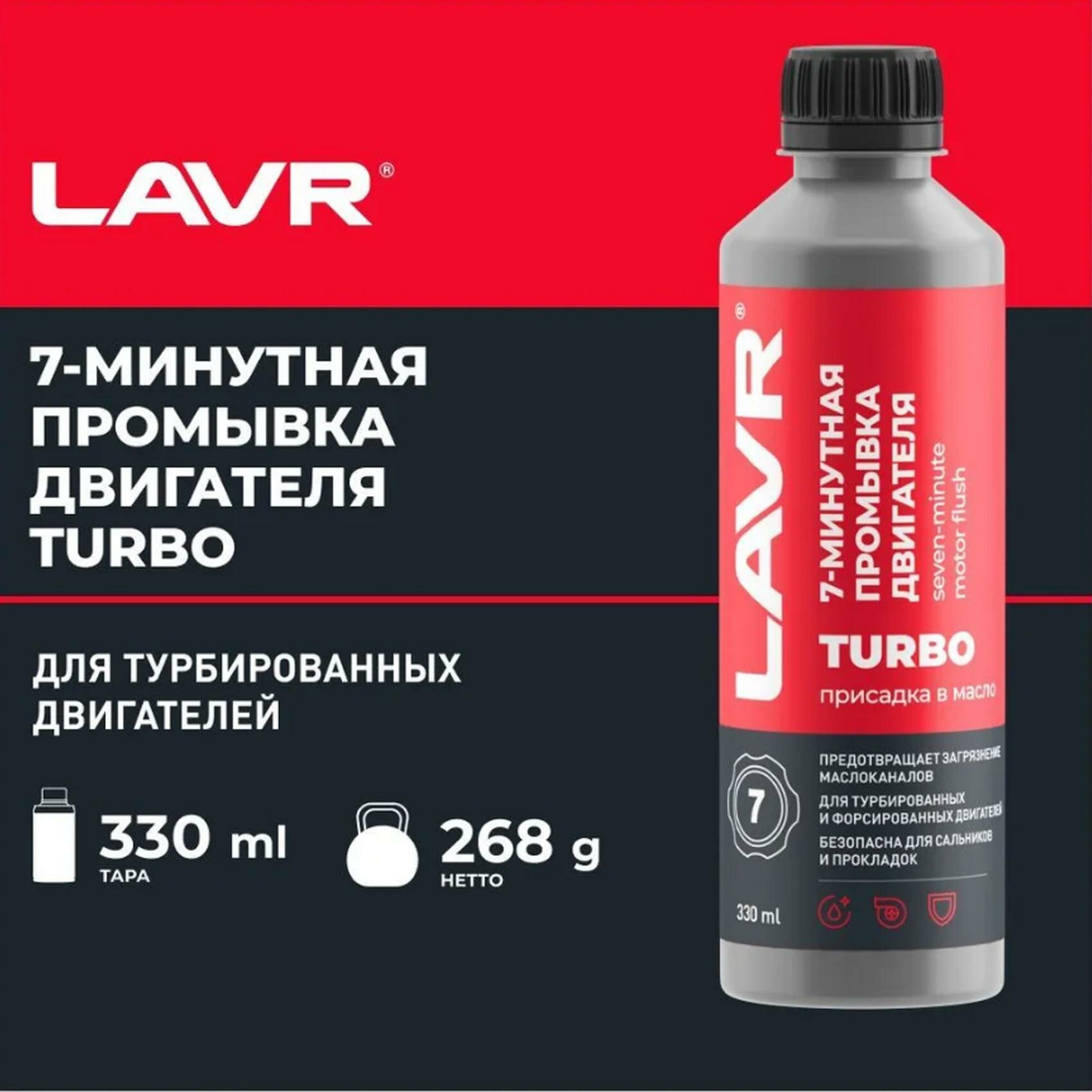 Уникальный комплекс для максимальной чистоты мотора. 7-минутная промывка двигателя LAVR – это не просто промывка системы смазки, а уникальный запатентованный состав для моторов сложной конструкции, который устраняет отложения на молекулярном уровне.