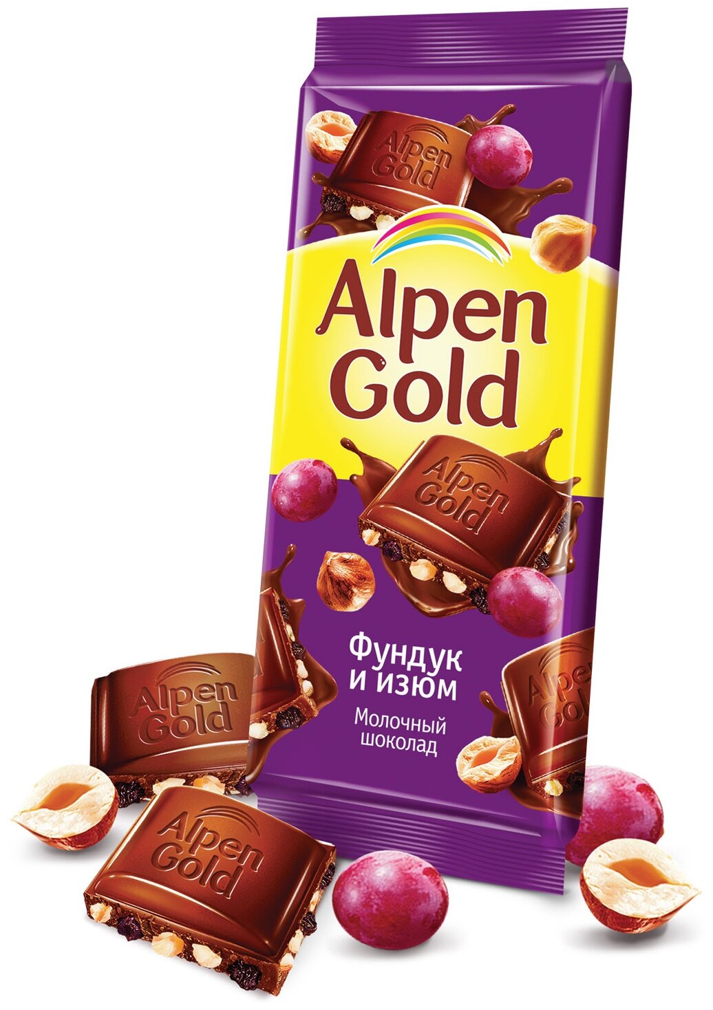 Шоколад Alpen Gold "Фундук и изюм" молочный 85гр (7622201427184)