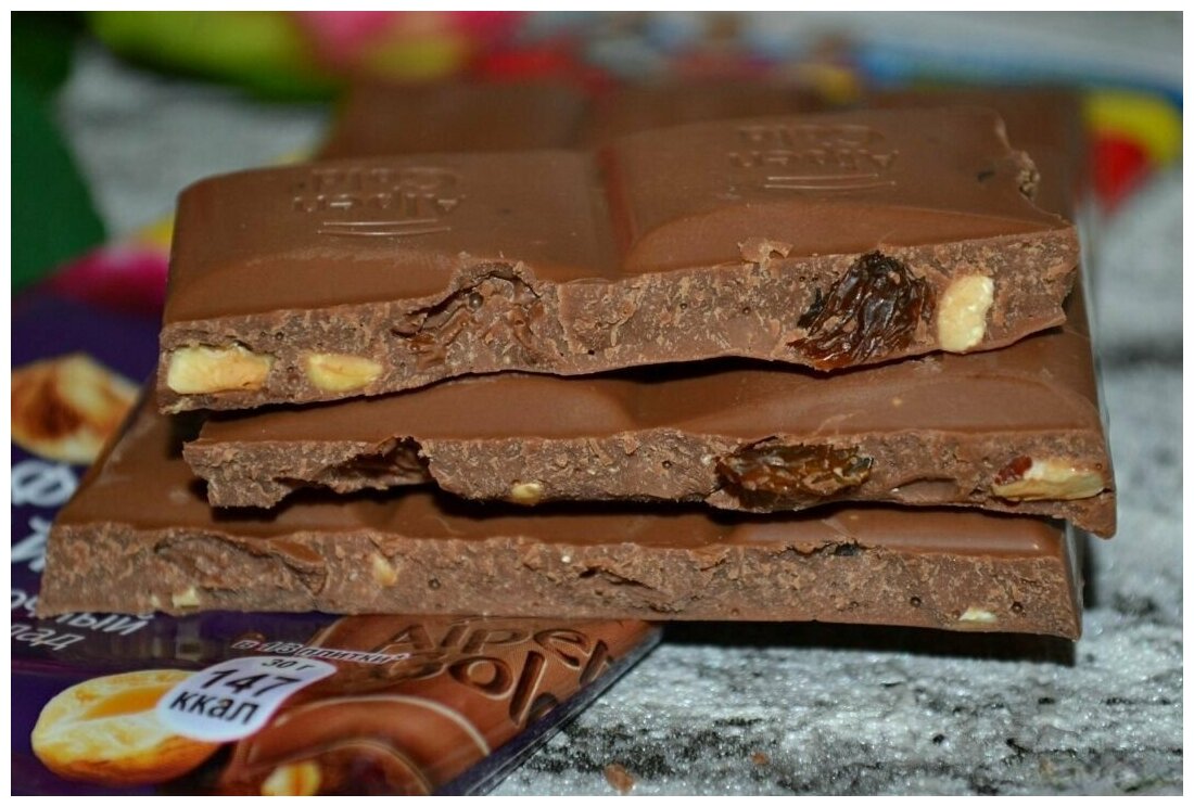 | Состав | Сахар, изюм, какао тертое, масло какао, сухое цельное молоко, сухая молочная сыворотка, фундук обжаренный дробленный, молочный жир, эмульгаторы (лецитин соевый, Е476), ароматизатор ванилин идентичный натуральному. Содержит фундук, молочные продукты, лецитин соевый |