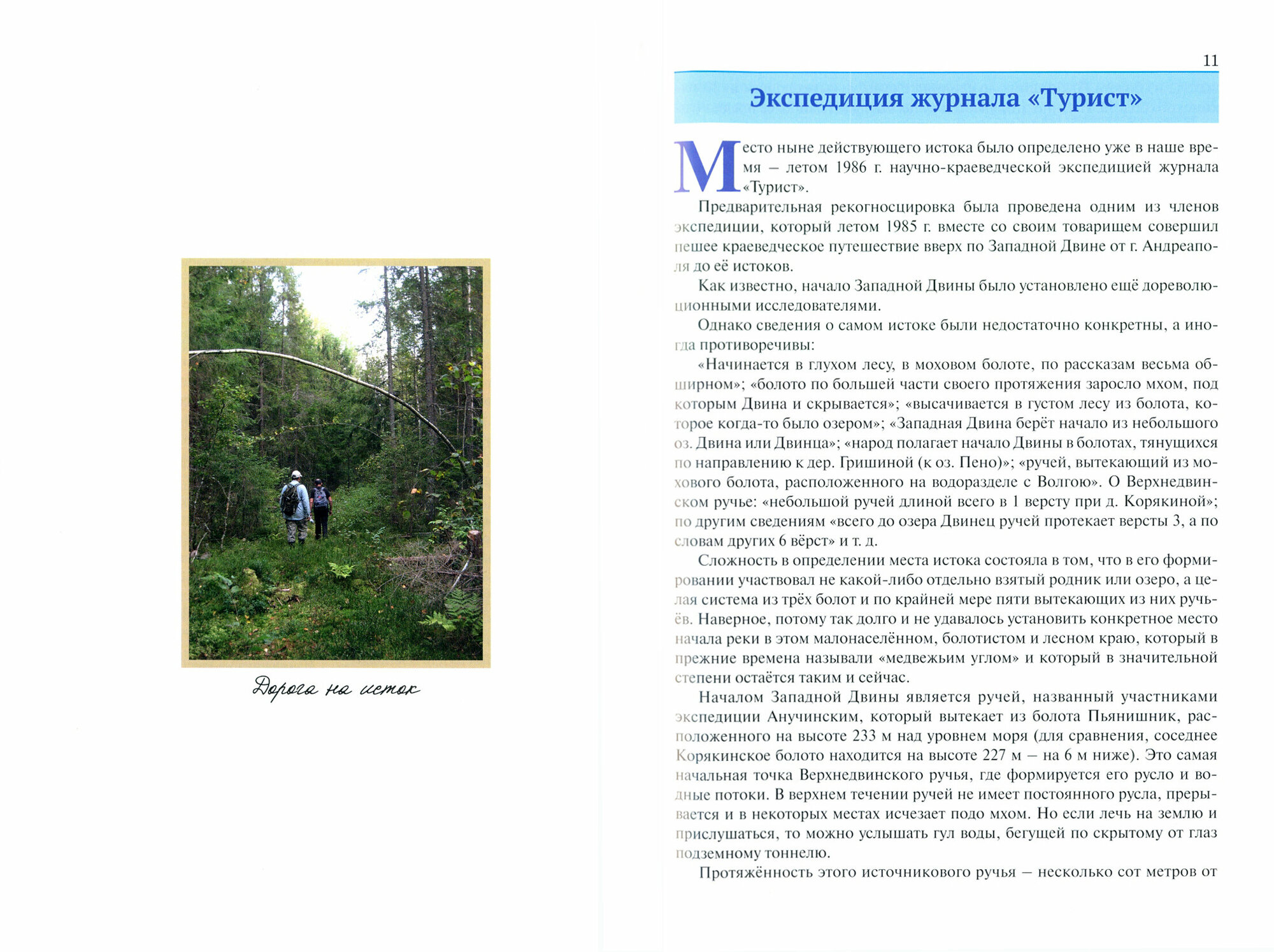 Краткий справочник-путеводитель - результат многолетней работы группы краеведов по исследованию истока Западной Двины, место которого было установлено в 1986 г. экспедицией журнала "Турист". В нём собраны сведения по истории исследования истока, его благоустройству, приводятся карта и список достопримечательных и памятных мест, краткий топонимический словарик, а также список литературы. В приложении публикуется глава "Около истоков Западной Двины" очерка географа Д.Н. Анучина "Из поездки к истокам Днепра, Западной Двины и Волги".