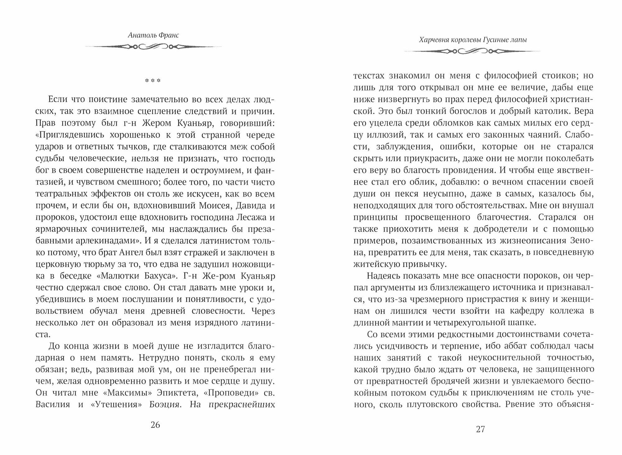 "Харчевня королевы Гусиные лапы" и "Суждения господина Жерома Куаньяра" - сатирические повести французского писателя Анатоля Франса об аббате Жероме Куаньяре. Главный герой умен, мудр, великодушен, благочестив, но ведет греховную жизнь, оправдывая свои "падения" тем, что именно они воспитывают в нем дух смирения. Дилогия о жизни и учении аббата Жероме Куаньяра, как "Восстание ангелов" или "Остров пингвинов" раскрывают перед читателем Анатоля Франса как утонченного философа: без всякой сентиментальности он остро критикует современную ему действительность, раскрывая нравственные падения и несовершенство человеческой натуры, но при этом Франс не судит и не морализирует, а принимает целиком все слабости и терзания человеческой души. Человек слаб, и путей к его слабости великое множество.