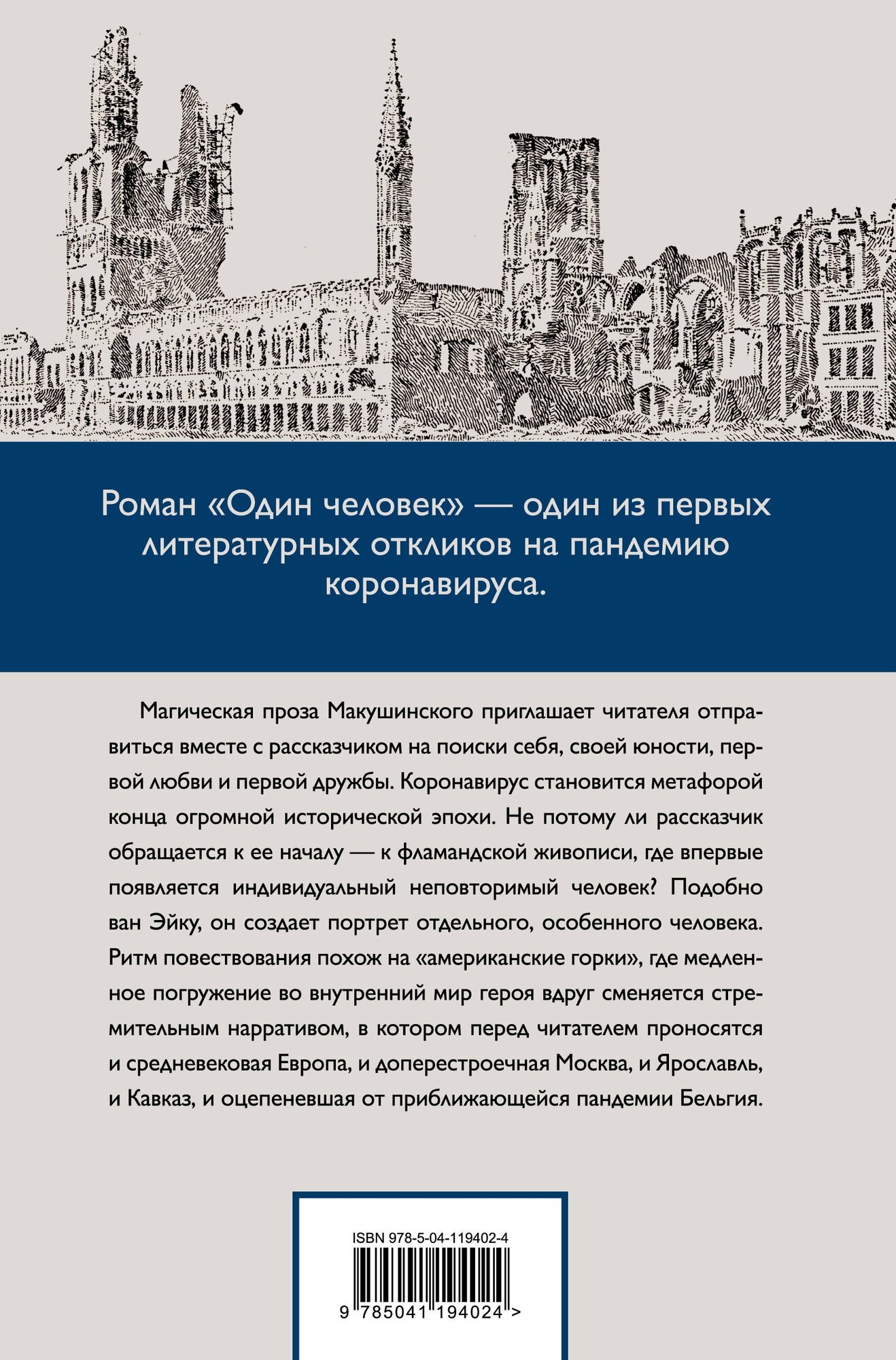 Роман "Один человек" - один из первых литературных откликов на пандемию коронавируса. Магическая проза Макушинского приглашает читателя отправиться вместе с рассказчиком на поиски себя, своей юности, первой любви и первой дружбы. Коронавирус становится метафорой конца огромной исторической эпохи. Не потому ли рассказчик обращается к ее началу - к фламандской живописи, где впервые появляется индивидуальный неповторимый человек? Подобно ван Эйку, он создает портрет отдельного, особенного человека. Ритм повествования похож на американские горки, где медленное погружение во внутренний мир героя вдруг сменяется стремительным нарративом, в котором перед читателем проносятся и средневековая Европа, и доперестроечная Москва, и Ярославль, и Кавказ, и оцепеневшая от приближающейся пандемии Бельгия.