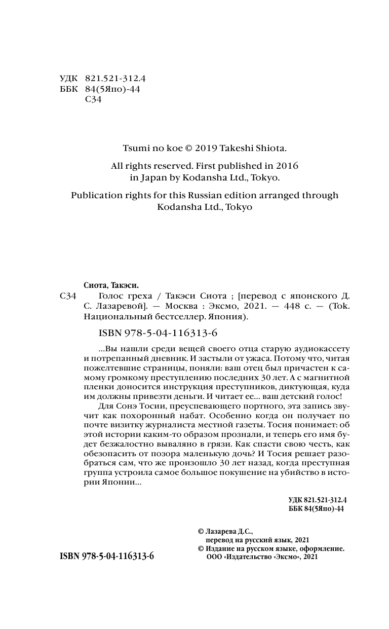 Книга: Голос греха (Такэси Сиота); Эксмо, Inspiria, Редакция 1, 2022