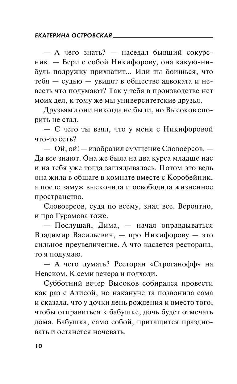 Очередной роман Островской из цикла о частном детективном агентстве... Мне роман, в целом, хоть и понравился, но показался не таким ярким, как, например, "Передай привет небесам". Не хватило лихости, что ли, и закрученности сюжета. Хотя роман всё же стоит прочитать. Тем, кто любит сюжет детектива поспокойнее, что ли. Так что, рекомендую! Потому что всё остальное прописано на высоком уровне, хоть и без накала сильных страстей...