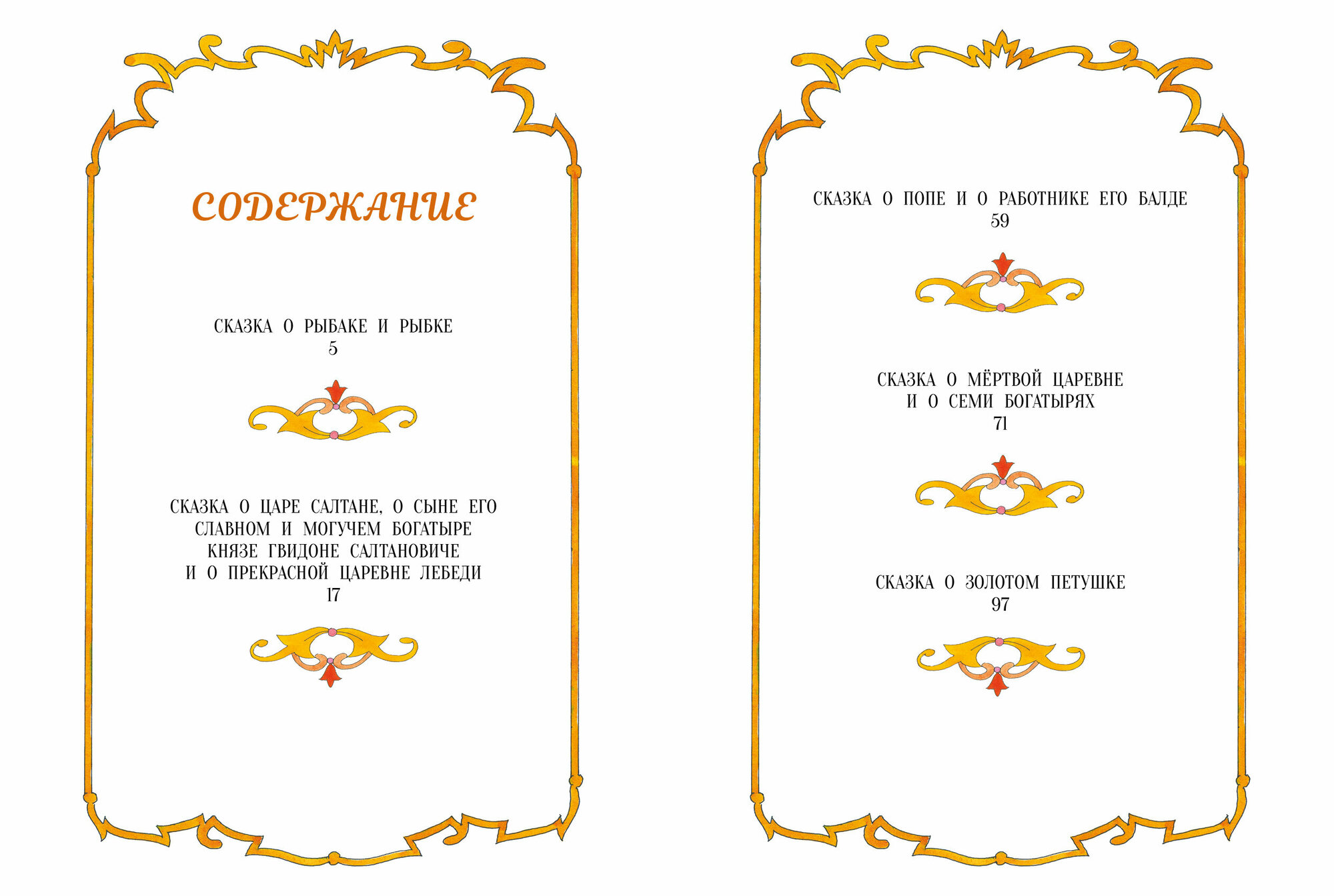 В сборник вошли сказки: "Сказка о царе Салтане", "Сказка о рыбаке и рыбке", "Сказка о попе и о работнике его Балде", "Сказка о мертвой царевне и о семи богатырях", "Сказка о золотом петушке".