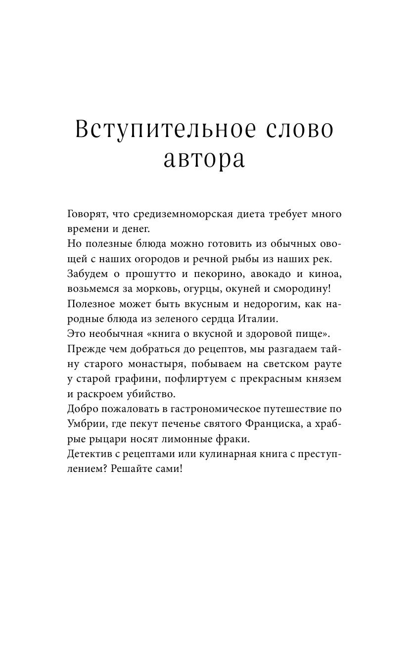 Новое расследование Александры Емельяновой приведет в прекрасную Умбрию, где пекут любимое печенье Франциска Ассизского. И верный рыцарь уже спешит на помощь... в лимонном фраке».