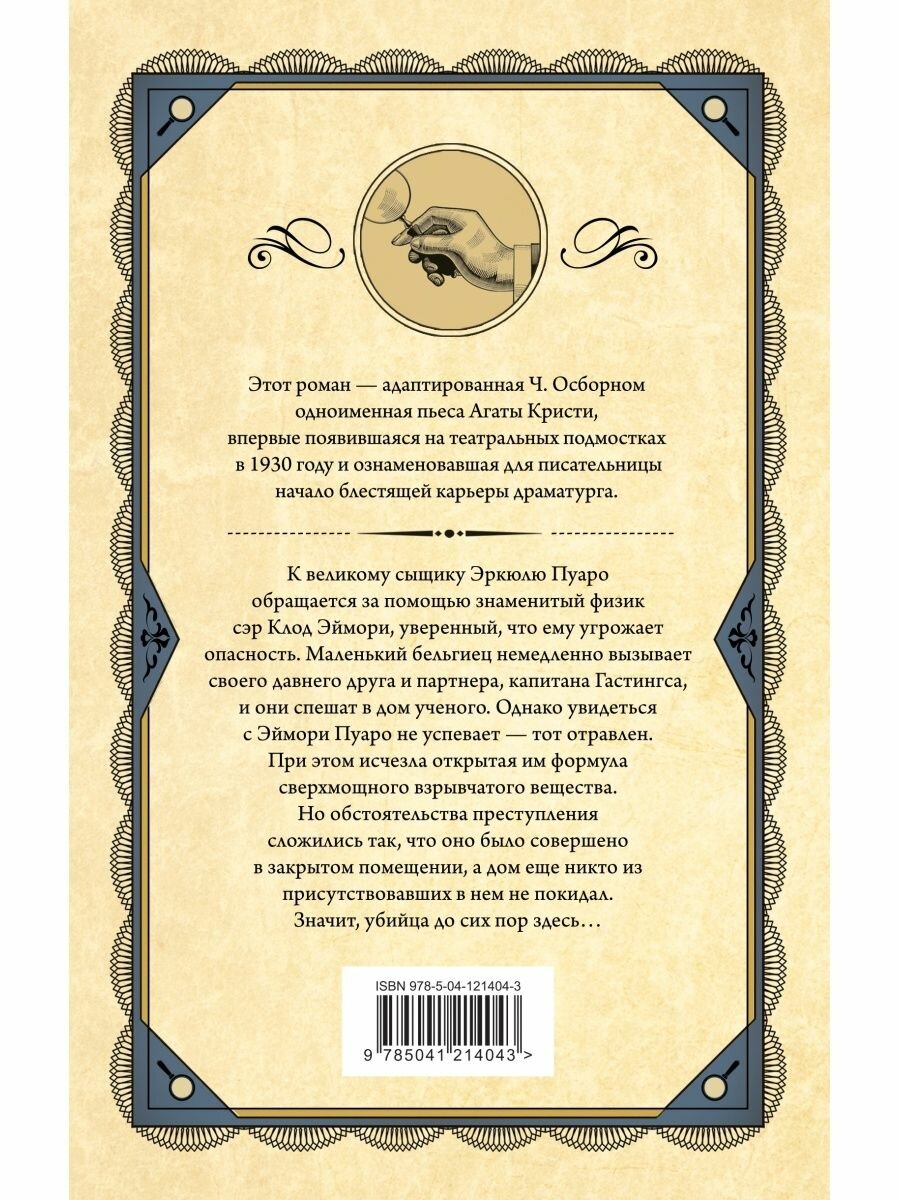 К великому сыщику Эркюлю Пуаро обращается за помощью знаменитый физик сэр Клод Эймори, уверенный, что ему угрожает опасность. Маленький бельгиец немедленно вызывает своего давнего друга и партнера, капитана Гастингса, и они спешат в дом ученого. Однако увидеться с Эймори Пуаро не успевает - тот отравлен. При этом исчезла открытая им формула сверхмощного взрывчатого вещества. Но обстоятельства преступления сложились так, что оно было совершено в закрытом помещении, а дом еще никто из присутствовавших в нем не покидал. Значит, убийца до сих пор здесь…