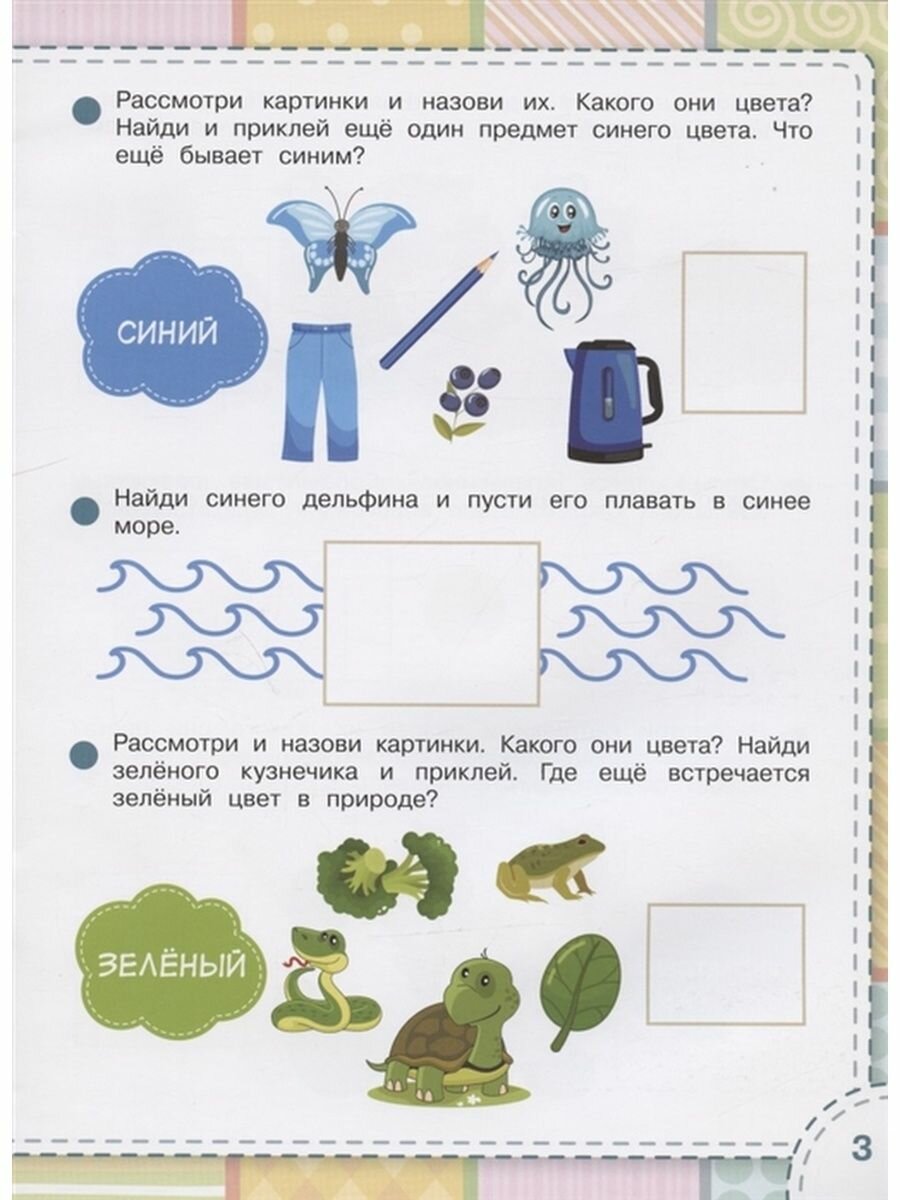 Подойдет для первого знакомства с формами и цветами, все пособие яркое и красочное, ребенок быстро садится заниматься. Свое дело делают и наклейки, которые нужно приклеивать и можно переклеивать. Вся серия этих пособий мне нравится, по очереди занимаемся в каждой тетрадочке.