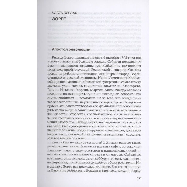 Замечательная книга, уникальный труд двух авторов, досконально знающих все по этой теме. Дважды прочла ее, потому что поразило ее содержание -- о каких людях здесь написано!.. Труднейшая и великая деятельность Зорге и его группы, их преданность и верность, захотелось узнать о каждом из них, что их мотивировало, интересно описана Япония тех лет, -- очень много интереснейших фактов! Но самое главное -- это личность Зорге, авторы дали нам возможность погрузиться в его духовный мир, и мы просто ощущаем весь драматизм его судьбы, -- адски напряженная работа, не совсем крепкое здоровье, безысходность из-за невозможности приехать к любимой жене, тут, надо сказать, любой человек просто не выдержал бы, и что-нибудь произошло бы с его психикой. И вот тут в Японии судьба или Бог посылает ему эту женщину, Ханако, которая истинным чутьем поняла всю громадность его личности и его настоящий гуманизм, -- и осталась ему верна, до самой смерти, а прожила почти до 90! Увековечила его память, примеров такой верности просто единицы!
