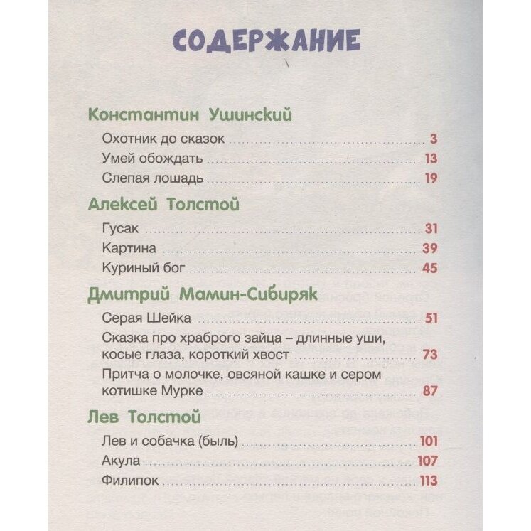 | Автор(ы) | Ушинский Константин Дмитриевич; Толстой Алексей Николаевич; Мамин-Сибиряк Дмитрий Наркисович; Толстой Лев Николаевич; Пришвин Михаил Михайлович; Бажов Павел Петрович; Чарская Лидия Алексеевна; Платонов Андрей Платонович; Бианки Виталий Валентинович |