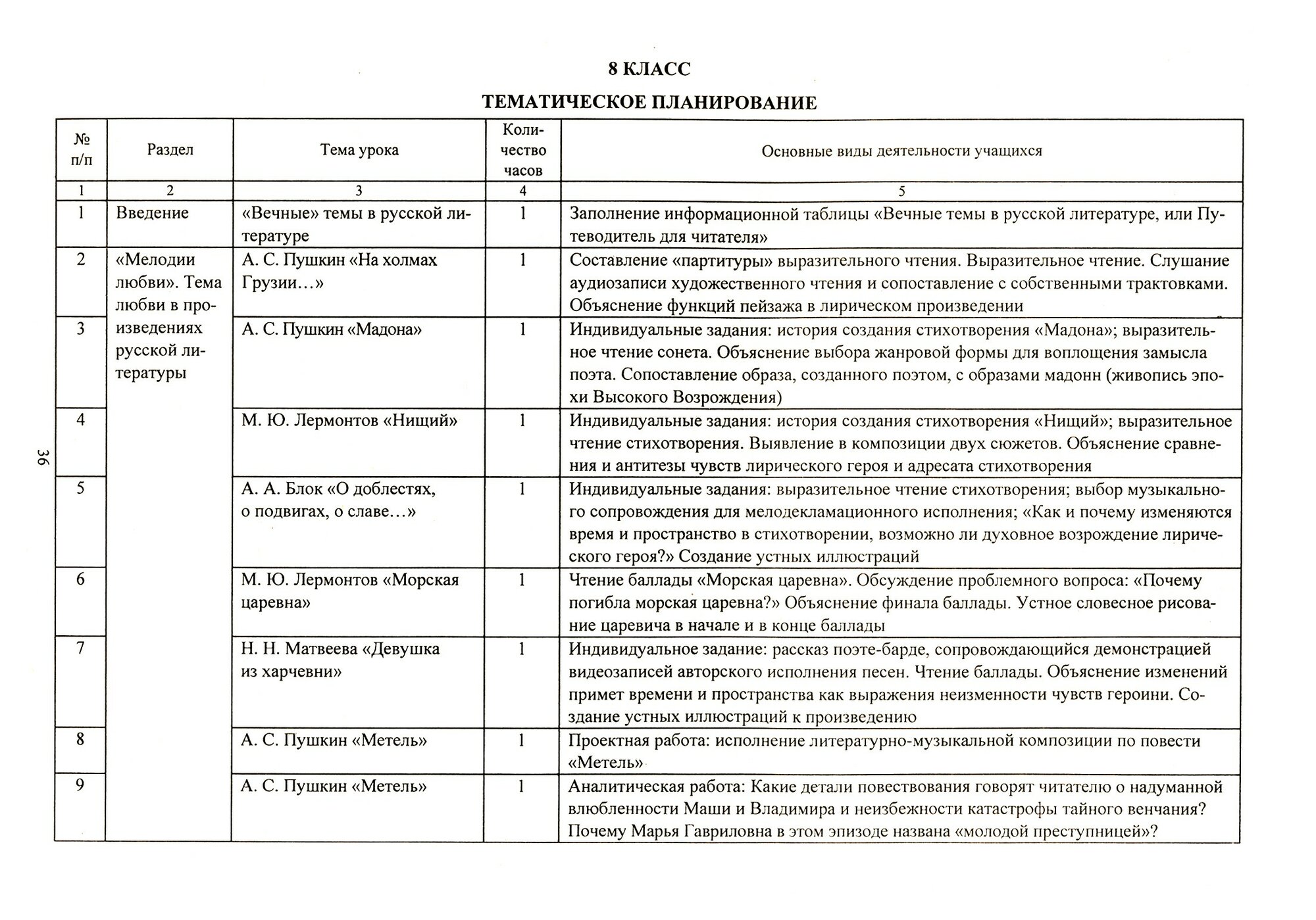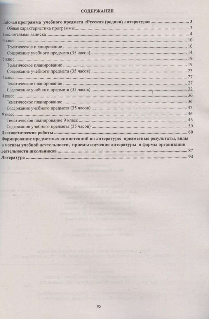Рабочая программа включает "Пояснительную записку", "Содержание учебного предмета", "Тематическое планирование" с определением основных видов деятельности учащихся. В "Пояснительной записке" отражены общая характеристика учебного предмета "Русская (родная) литература", цели изучения предмета и задачи обучения, требования к личностным, метапредметным и предметным результатам освоения программы, а также планируемые результаты изучения предмета в 5-9 классах. В "Содержании учебного предмета" указаны произведения для внеклассного чтения, теоретико-литературные знания учащихся и элементы культурного пространства.
