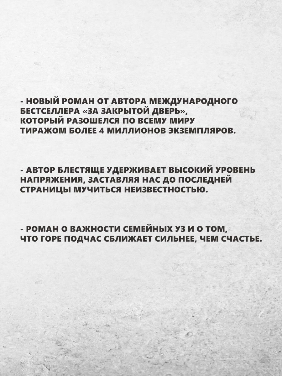 Мне очень нравятся триллеры Пэрис, от них невозможно оторваться, пока не дочитаешь до конца. Хоть в книге описываются события всего лишь одного дня, она несомненно хороша. Но тяжеловата в моральном плане.