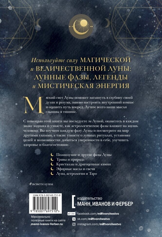 Волшебное путешествие по удивительному миру чародеев и заклинаний. Справочник о верованиях и лунных божествах различных народов, о влиянии различных фаз Луны на жизнь человека и о различных способах использования кристаллов, трав, ритуалов и Таро при работе с лунной магией. Вы узнаете более 100 магических обрядов, прочитает про знаки зодиака и поймете, как астрологические фазы влияют на жизнь человека. Синхронизировав свои естественные ритмы с ритмами Луны, вы привнесете спокойствие в вашу жизнь, отдохнете от нескончаемого потока информации и шума вокруг. Вместо этого вы обратитесь к гипнотическому свету Луны и заглянете в глубину своей души и разума, чтобы определить или напомнить себе, что для вас важно, заново настроить компас и оценить путь вперед. Лучше всего наши мысли слышны в тишине.