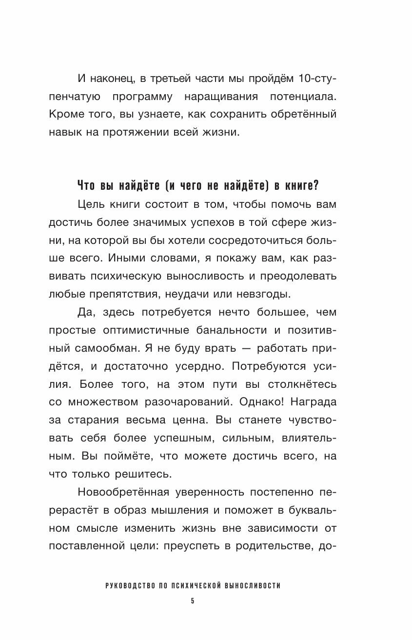 Я искренни не понимаю кому эта книга может дать какие-то новые знания. Все, что в прочла и так было уже в моей голове, это были очевидные же вещи. Книга по сути нечего и не несёт, задания все очень похожи. Я все их выполнила.почти на каждой страничке есть слова «психическая устойчивость» и это невероятно раздражало. Из глав в главу он говорит одно и тоже меняя последовательность слов. Это просто не моя книга, во многом я не могу согласится с автором, а где то вещи настолько очевидные что о них и писать не надо.