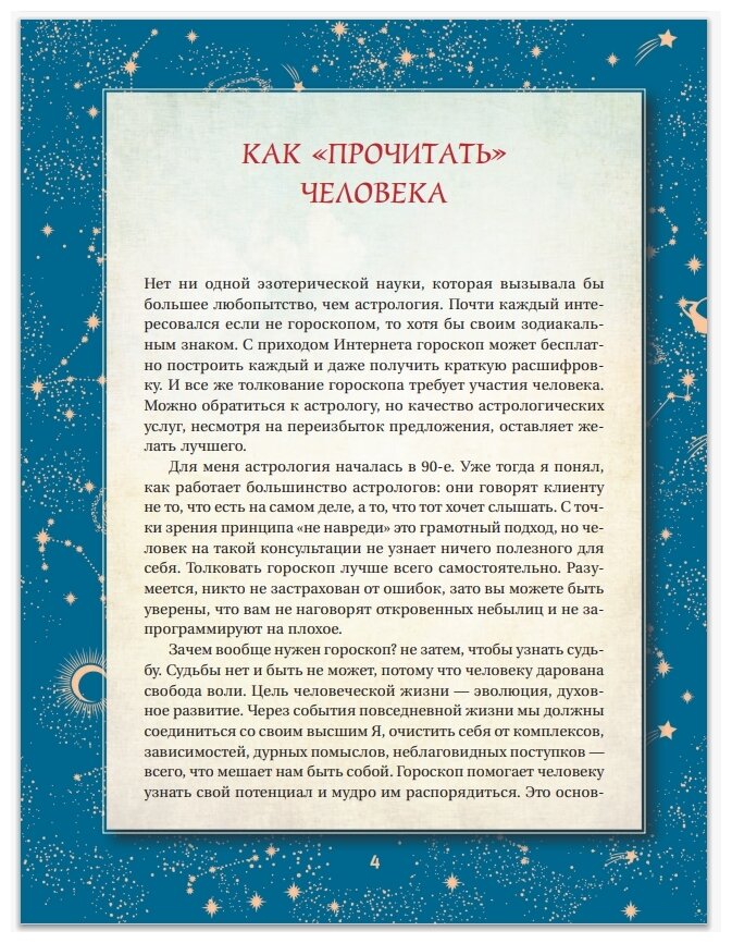 Неудачная книга. Автор бездумно пересказывает байки своих малограмотных учителей. Например о том, что Хирон – фиктивная планета. В действительности Хирон – реальный космический объект – астероид. Или такой «перл»: «Лунные узлы – это точки пересечения лунной и земной орбит»:) Собственный неудачный опыт астрологического консультирования автор выдает за истину, утверждая, что большинство астрологов говорят клиенту не то, что есть на самом деле, а то, что тот хочет услышать. По фразе «Судьбы нет и быть не может, потому, что человеку дарована свобода воли» становится понятно то, что автор просто-напросто не умеет делать прогноз событий. Ведь если судьбы нет, то как понимать, что в астрологии существует огромное количество методов прогноза? На обложку книги автор вынес фразу «глубинное влияние звезд, планет и созвездий»:) тем самым приравняв созвездия к знакам Зодиака, что в корне неверно, а «влияние звезд, планет» аналогично утверждению о том, что часы влияют на время:)
