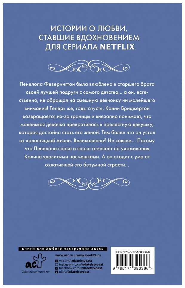 Очередная история Бриджертонов не оставила равнодушной. Пенелопа и Колин- кто бы мог подумать, что это возможно. Оказалось, у них много общего, о чем они не догадывались пока не узнали друг друга ближе. Тонкий юмор, острый ум, общие интересы. Романтичная история, как и вся серия.