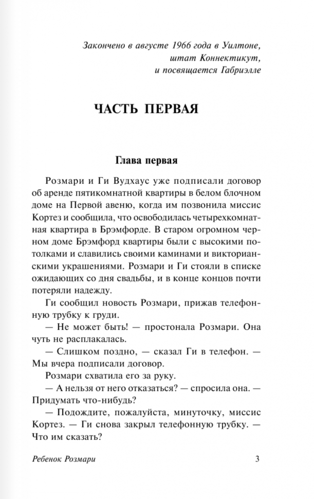 Редко мне попадаются книги-ужастики. Розмари и Ги - молодая пара, переехавшая в новую квартиру. Больше всего на свете Розмари хочет иметь ребенка, и спустя какое-то время ее желание осуществляется. Вот тут то и начинают происходить разные странности. Девушка понимает, что вокруг нее и ее еще не родившегося ребенка ведётся заговор. Книга интересная, читается залпом, хотя концовка показалась какой-то простенькой.