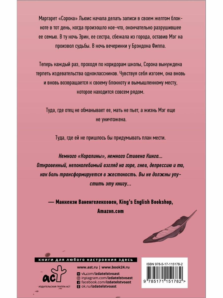 Как читатель, вы входите в разум Маргарет или, как она предпочитает, Сороки. Станьте свидетелем ее разваливающейся жизни и почувствуйте отчаяние и гнев, которые начинают поглощать ее после того, как ее домашняя и школьная жизнь рушатся.