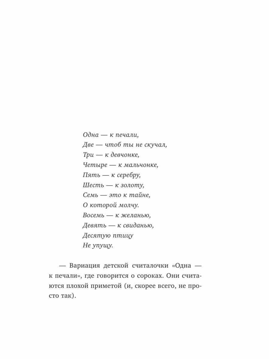 Таким образом, Катрина Лено не приглашает вас осторожно войти в мир «Сороки», она хватает вас и дергает за собой для полного погружения. Ее реплика о том, что у грусти отрастают конечности и она уходит от «Сороки», нашла такой глубокий отклик, что стала истинным лицом скорби. Это вещь, наделенная силой, и автор иллюстрирует, насколько это порочно, насколько реально, насколько индивидуально для каждого человека. Проблемы, связанные с «Сорокой», являются реальностью для людей во всем мире, и фантазия о мести, которую она создает, несомненно, является самым заветным желанием тех, кто страдает от тех же проблем. Мэгги не является теплой, пушистой главной героиней. Она глубоко порочна, она бессердечна и жестока по отношению к тем, кто действительно заботится о ней. Но она представляет собой кристально чистую картину душевных страданий жертв преступлений, членов семей алкоголиков и каждого подростка, над которым издевались. В совокупности, это всё прорисовывается в превосходном тексте с удивительно ярким стилем. В заключение моего отзыва - я однозначно полюбил автора данной книги. -