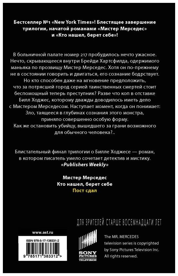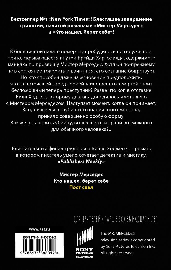 из трилогии "Мистер Мерседес", пожалуй третья часть мне понравилась больше всего. Весьма реальная история в начале, много мистики в конце. Газлайтинг как способ доведения до самоубийства, использование современных технологий - все описания на высоте. Но и главное - темы спасения ближнего, случайный прохожий, вырвавший из лап смерти... Будьте бдительны, помогайте ближним, боритесь со злом как можете...