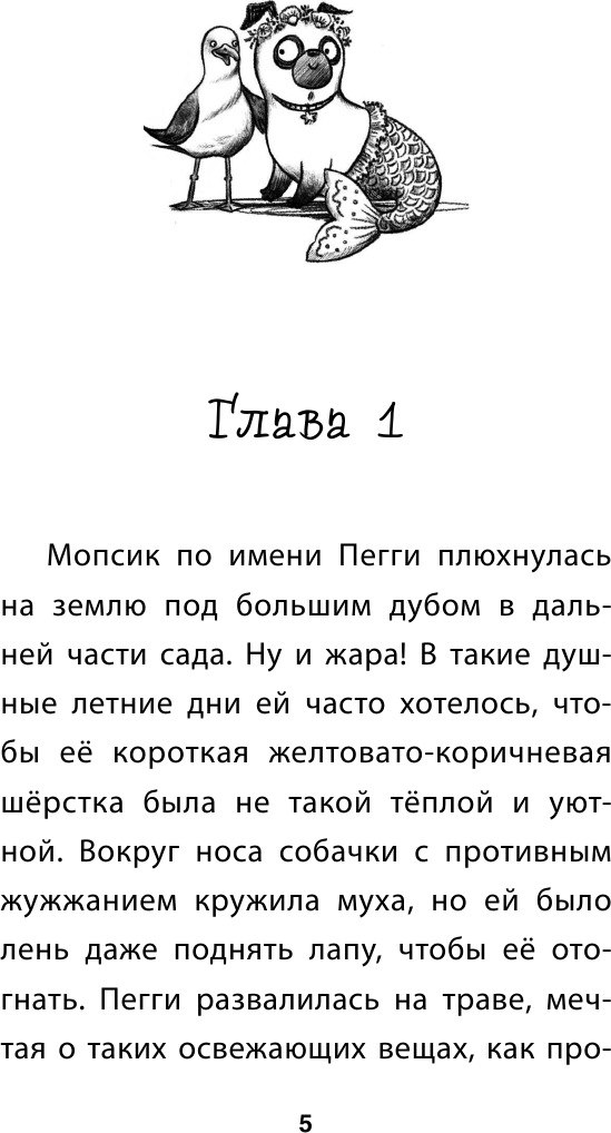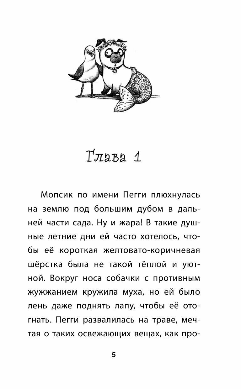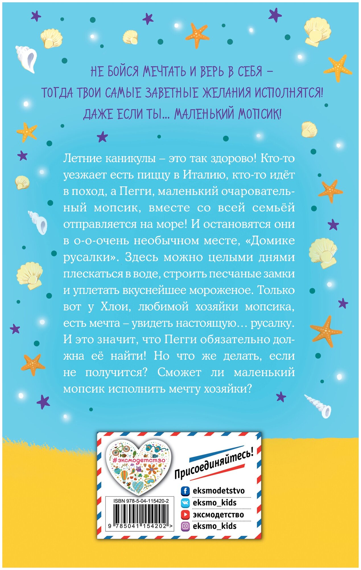 Новая книга про мопсика Пегги, дочка обожает эту серию, всегда переживает за Пегги. Книга рассчитана на читателя из начальной школы, много красивых черно-белых иллюстрации,крупный шрифт. В новой книге семья Пегги отправляется на летний недельный отпуск в "Домик русалки" в школьные каникулы и, конечно, берут с собой Пегги. Весь отпуск Пегги пытается помочь своей хозяйке Хлое встретить русалку, а вместо русалки получает много приключений. Вся серия интересная, дочка периодически из перечитывает, читать серию лучше по порядку.