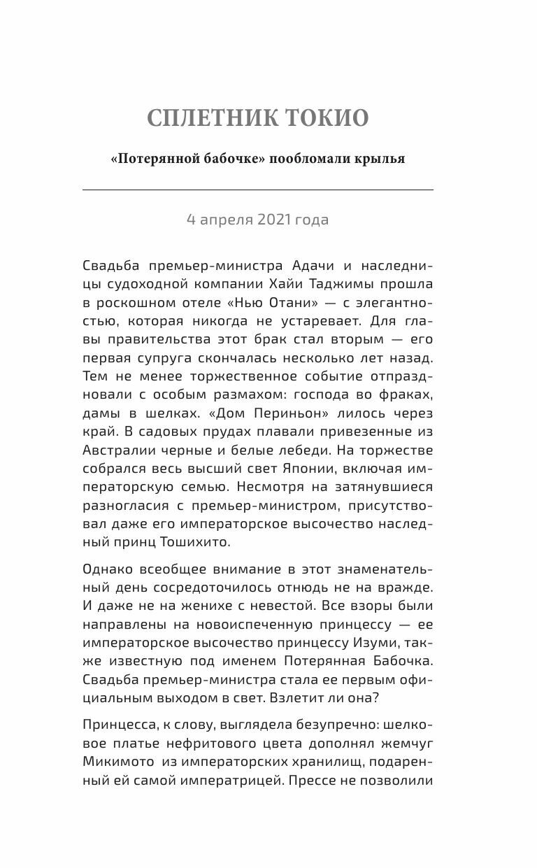 Очень милая, немного сказочная история в стиле фильма "Как стать принцессой", в антураже Японии. Запретная любовь японской принцессы и её телохранителя, императорского гвардейца, красавца Акио - очень нежная романтическая линия. О поиске девушки Изуми самой себя и своего места в жизни - нелегко внезапно стать принцессой, да ещё Японии. Книга мне понравилась, прочитала с удовольствием) И очень красивая, нежная обложка.