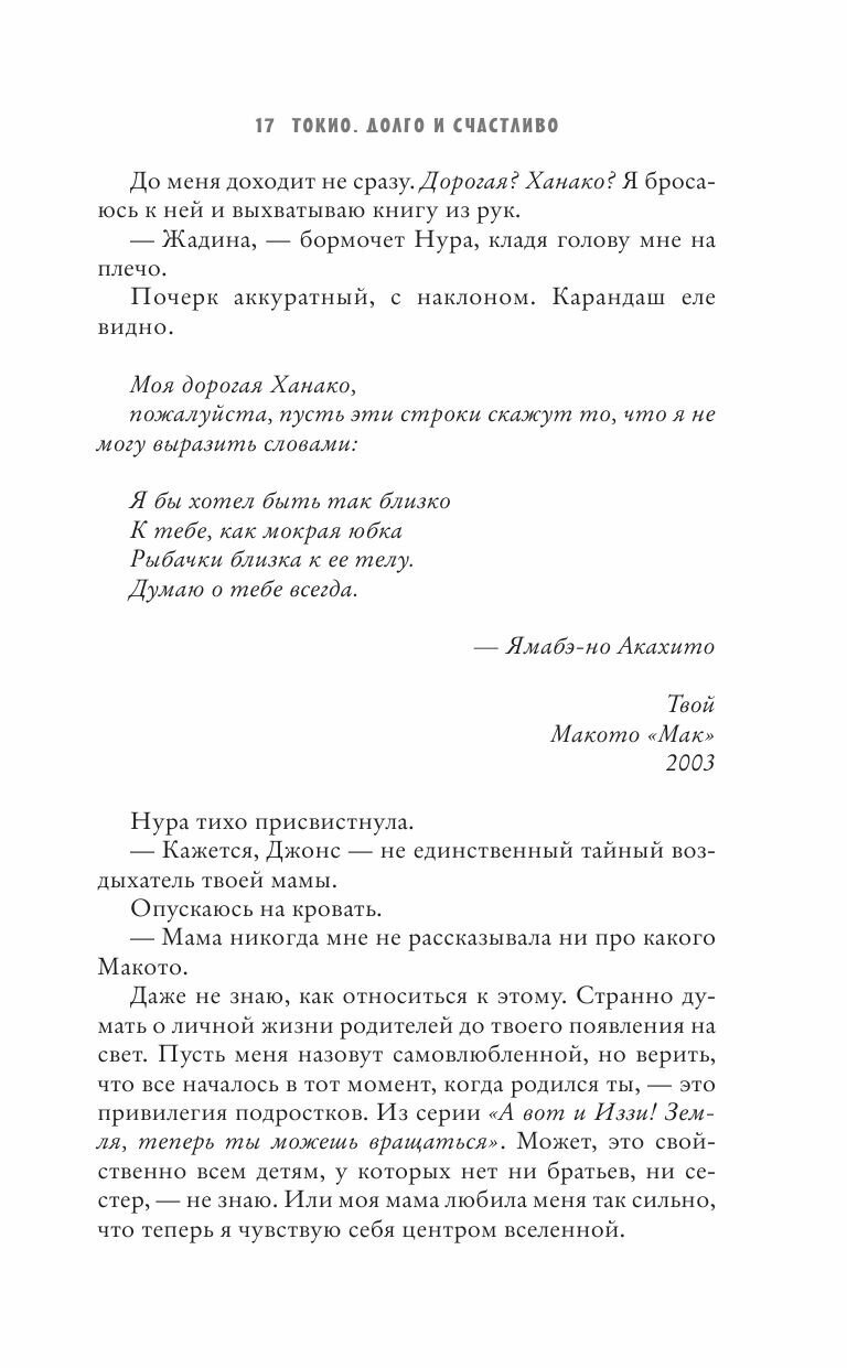 «Токио. Долго и счастливо» – на данный момент это единственный роман начинающей писательницы Эмико Джин, который переведен на русский язык. Книга стандартного размера с сероватыми страницами, но достаточно светлыми для комфортного чтения. Обложка выполнена в твердом и полностью матовом переплете. Шрифт четкий и удобный для глаз.
