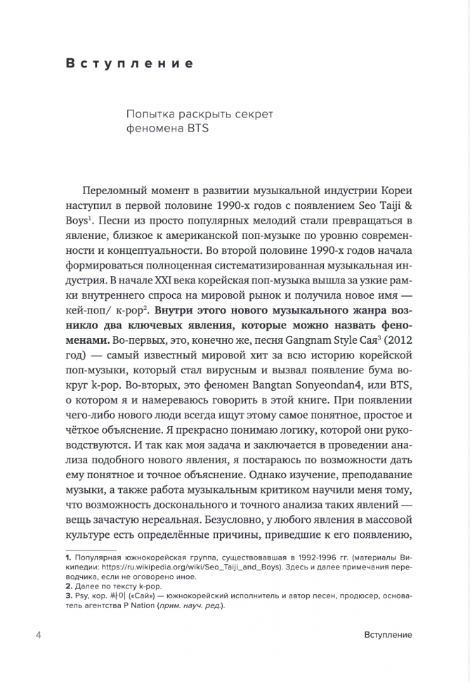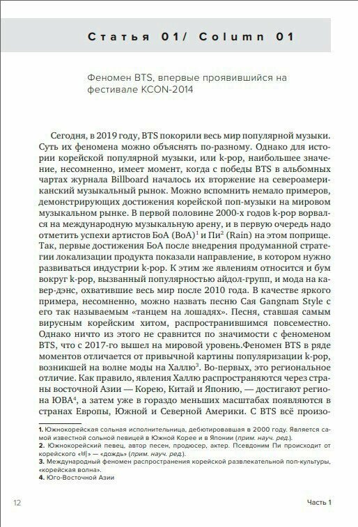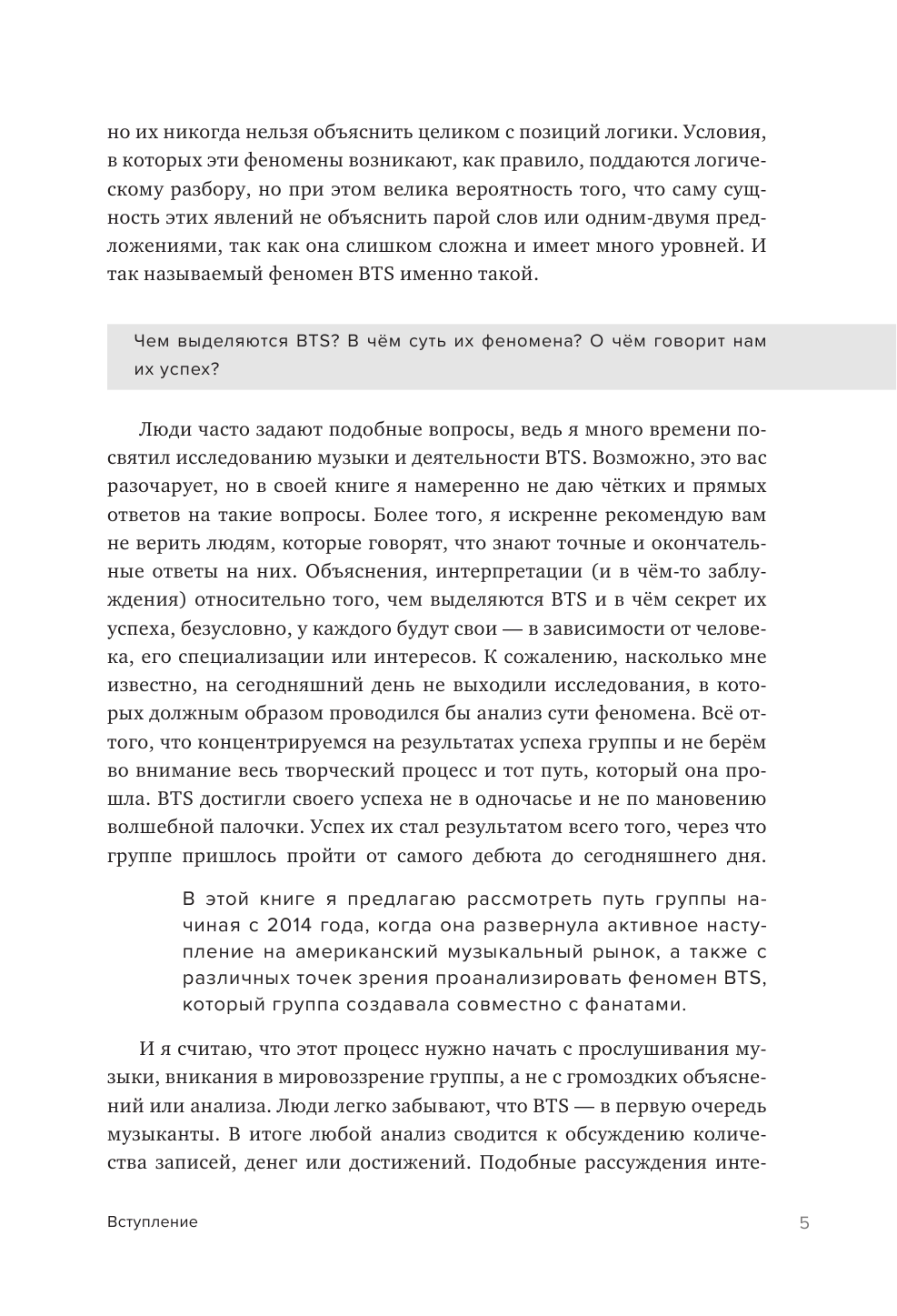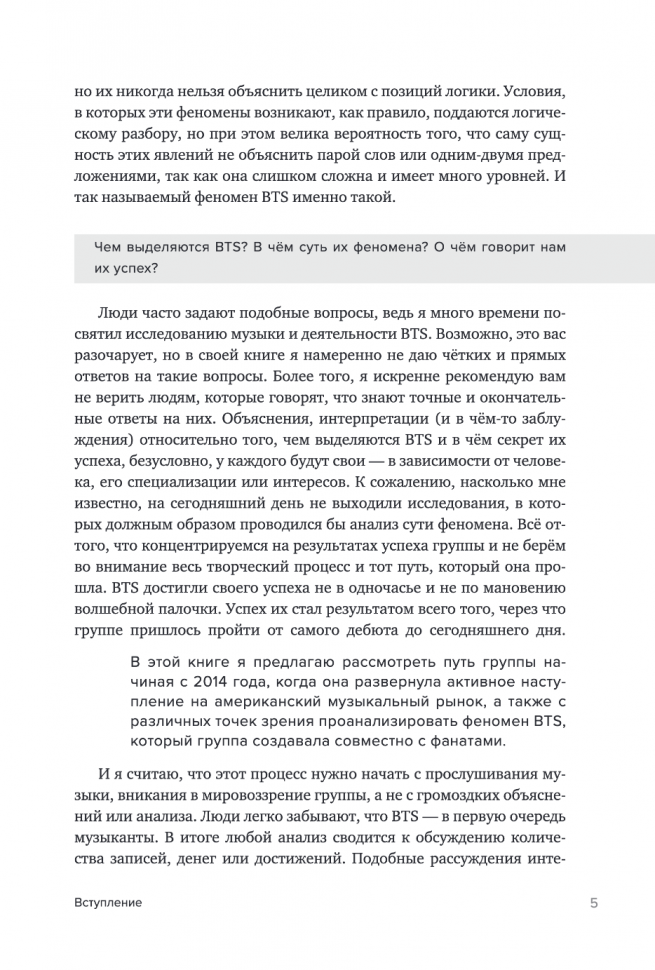 В чем уникальность BTS? В чем кроется секрет их популярности и такой безграничной любви со стороны фанатов, которые называют себя ARMY? В своей книге Ким Ёндэ, южнокорейский музыкальный критик, попытался ответить на эти и другие вопросы, возникающие в связи с феноменом BTS. Для этого он сделал подробный обзор дискографии группы, изучил историю возникновения жанра K-pop, взял интервью у людей, работавших с BTS, и попытался объяснить, как вокруг группы сложился такой фандом. Особое внимание Ким Ёндэ уделяет музыкальной составляющей, ведь именно в музыке BTS отразился дух и философия группы, ее искренность и энергия. Эта книга позволит по-новому взглянуть на творчество BTS и их путь в музыкальной индустрии.