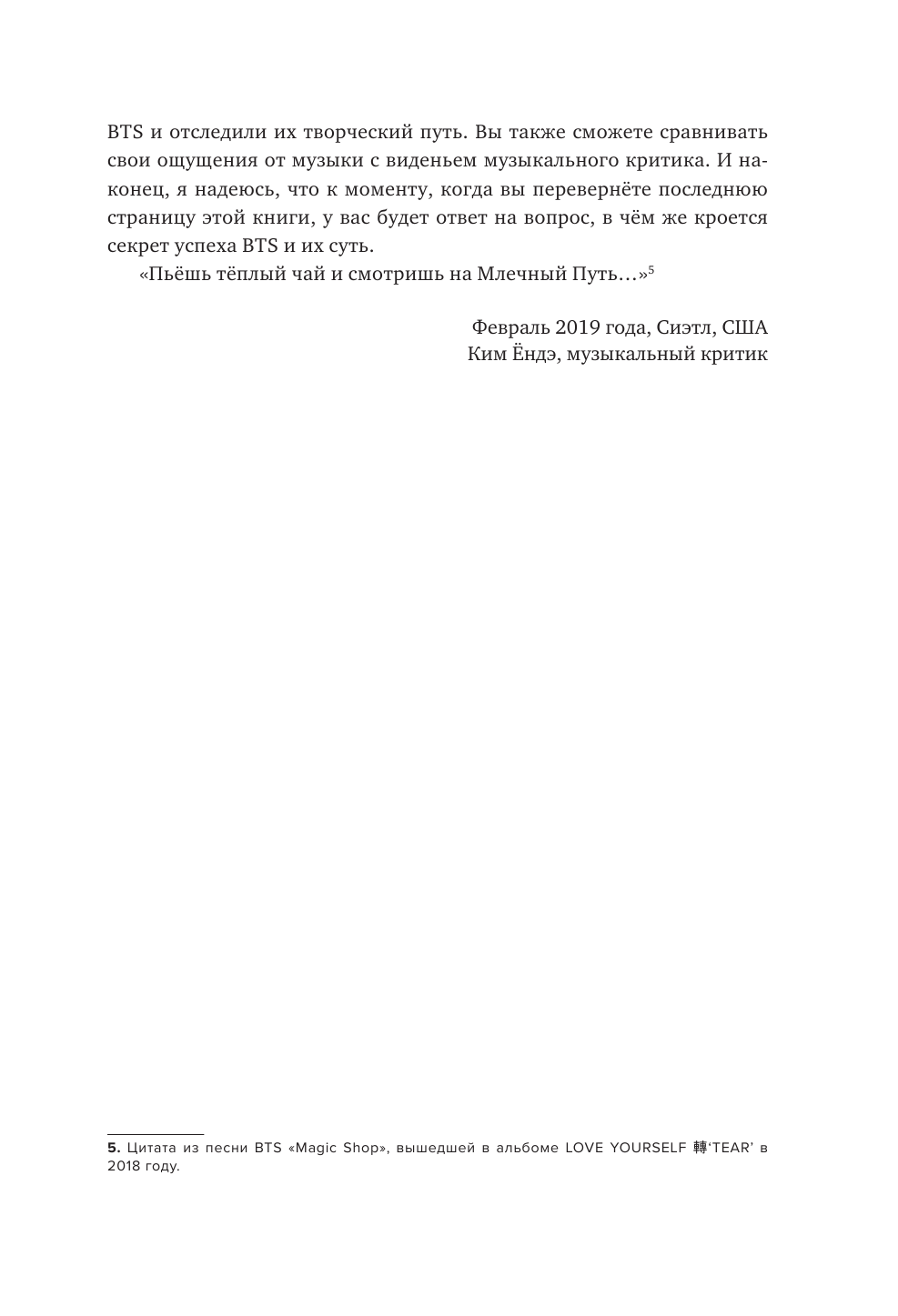 Ким Ёндэ – автор данной книги, является известным южнокорейским музыкальным критиком, часто непосредственно взаимодействующим с BTS. Данная книга является лучшим источником достоверной информации о группе и их творчестве и это, пожалуй, единственная книга на просторах России, которую я могу рекомендовать фанатам BTS и тем, кто только знакомится с группой. Эта книга мне нравится и я рекомендую её вам, так как автор заслуживает доверия к себе!