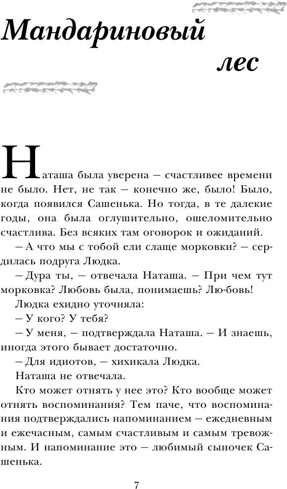 В книге "Мандариновый лес" собраны новеллы не о счастливых, а об обычных женщинах - таких, как мы с вами. Мария Метлицкая рассказывает о них неторопливо и обстоятельно. Ей действительно интересны люди, и своих героинь, даже не самых приятных, она любит и безмерно им сочувствует. Да, не все могут полюбить приемного ребенка как родного. Да, встречаются женщины алчные, меркантильные, во главу угла ставящие выгоду. Да, не всегда можно угадать "своего" человека и сделать его счастливым. Но это жизнь. И книги Метлицкой не о книжных, а о жизненных ситуациях. И в этом их безусловная ценность. Этим они и интересны десяткам тысяч читательниц. -