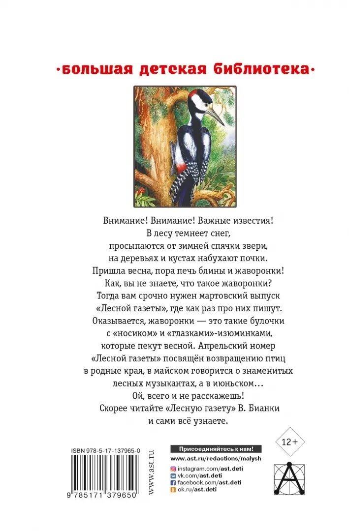 Я в последний день 1 четверти узнала, что за каникулы нужно прочитать В. Бианки "Лесная газета". Домашняя библиотека большая, но Бианки, к сожалению, нет. Что делать? На помощь пришёл мой любимый "Буквоед". На сайте нашла это произведение. Выбрала из нескольких книг, в которых оно есть именно эту. Выбрала по отзывам, по содержанию. Нашла в каких магазинах моего города эта книга есть в наличии, затем забронировала. А после сообщения о готовности брони пошла и выкупила. И вот благодарю "Буквоед" за то, что ещё не кончились каникулы, а сын уже прочитал заданную книгу! Почему выбрала именно эту? Крупный шрифт. Помимо "Лесная газета" ещё есть и другие рассказы Бианки. Иллюстраций нет, бумага тонкая. Но для школы самый идеальный вариант. Не объёмная и лёгкая.