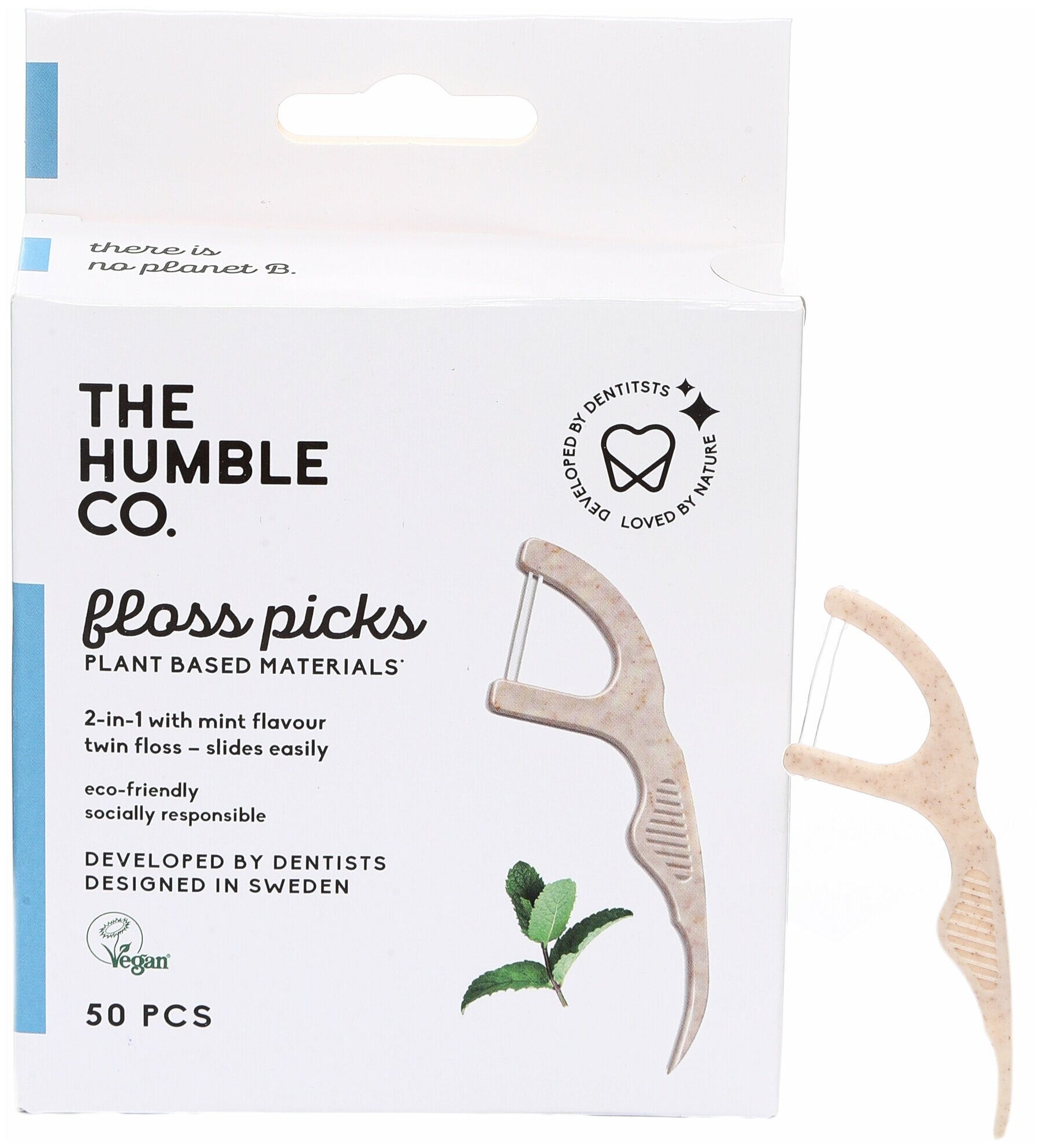 Dental Floss Picks - зубочистки с зубной нитью от The Humble Co. Двойная резьба обеспечивает эффективное удаление остатков пищи, а удобная форма держателя помогает легко очистить труднодоступные места. Изготовленные из кукурузного крахмала и упакованные в экологически чистую бумажную упаковку, зубочистки с зубной нитью Humble призваны минимизировать нагрузку на окружающую среду, обеспечивая при этом простоту и комфорт использования.