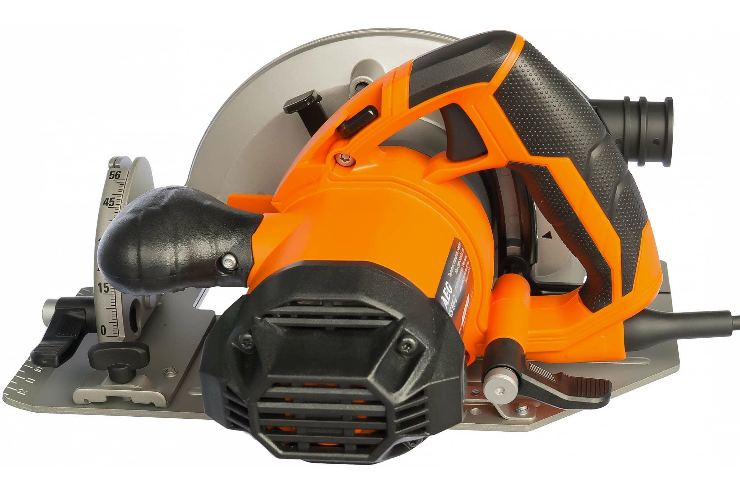 Дисковая пила AEG KS 66-2 поставляется с пильным диском диаметром 190 мм. Основная и дополнительная рукоятки имеют покрытие с микротекстурой, что обеспечивает комфортную работу пользователя. С помощью специального барашкового вентиля можно регулировать угол наклона пилы. Возможно пиление под углом 56 градусов. Предусмотрена система удаления опилок для сохранения чистоты рабочего места (патрубок под пылесос).