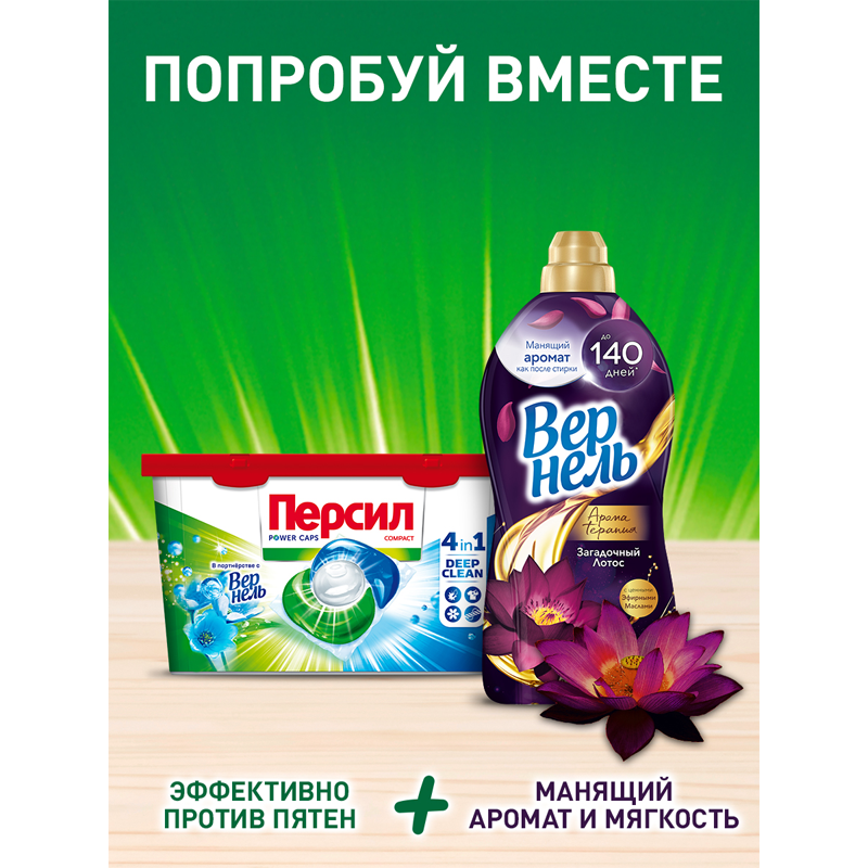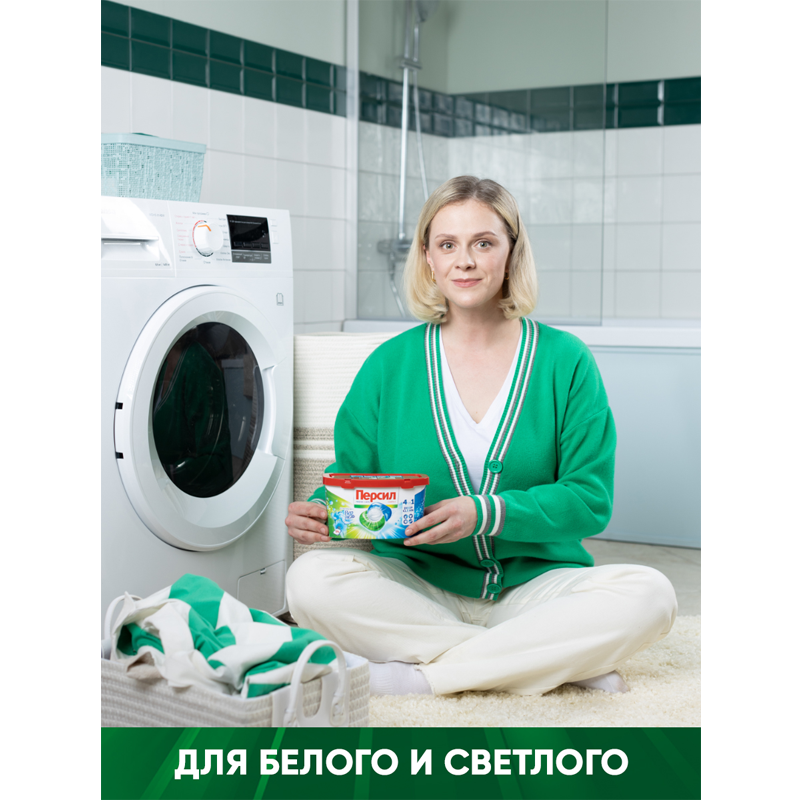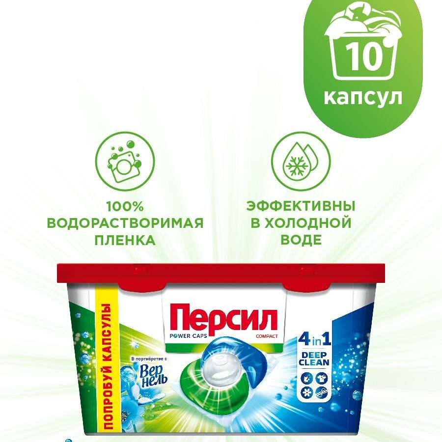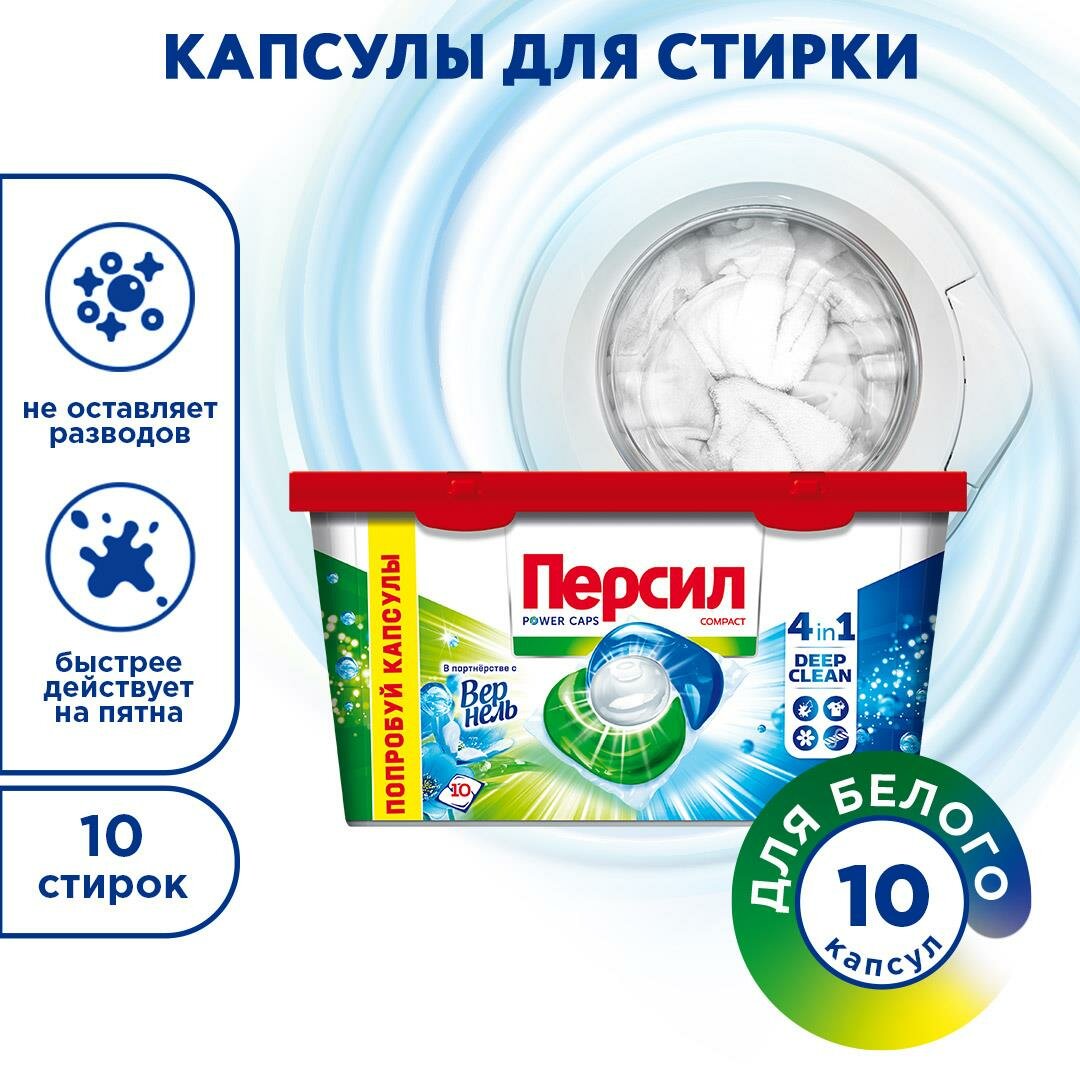 Капсулы для стиральной машины Персил Power Caps Свежесть от Vernel 4в1 для белого белья - это высококонцентрированное жидкое средство с формулой DEEP CLEAN. Благодаря комбинации 13 активных компонентов капсулы для стирки отлично удаляют пятна, сохраняя яркость вещей и свежесть надолго. Для безупречного результата стирки. Капсулы для стирки содержат 100% водорастворимую пленку, эффективны при стирке от 30 градусов. Не содержат фосфатов и хлорного отбеливателя. Капсулы для стирки легко использовать и хранить. Отличное удаление пятен. Яркость цвета. Приятный аромат и длительная свежесть. Капсулы для стирки подходят для белых и светлых изделий из хлопка, льняных, синтетических тканей и тканей из смешанных волокон (кроме шерсти и шелка). В наборе 10 капсул.