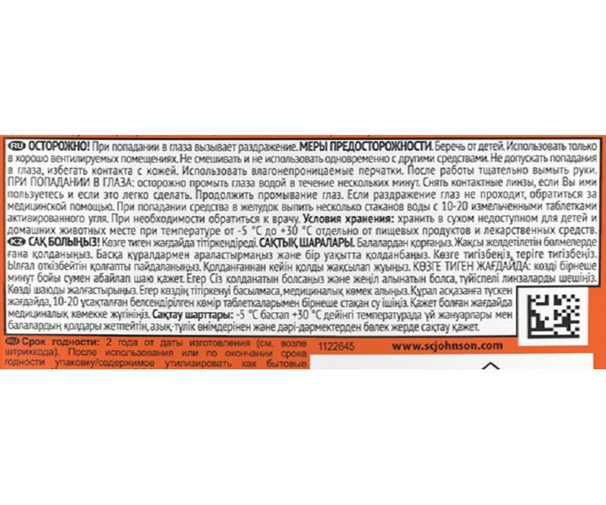| Состав | Вода, н-ПАВ ? 5% но ? 15%, алкилдиметилбензилламоний хлорид ? 15%, отдушка, цитрат натрия, кислота лимонная, D-лимонен, линалоол |