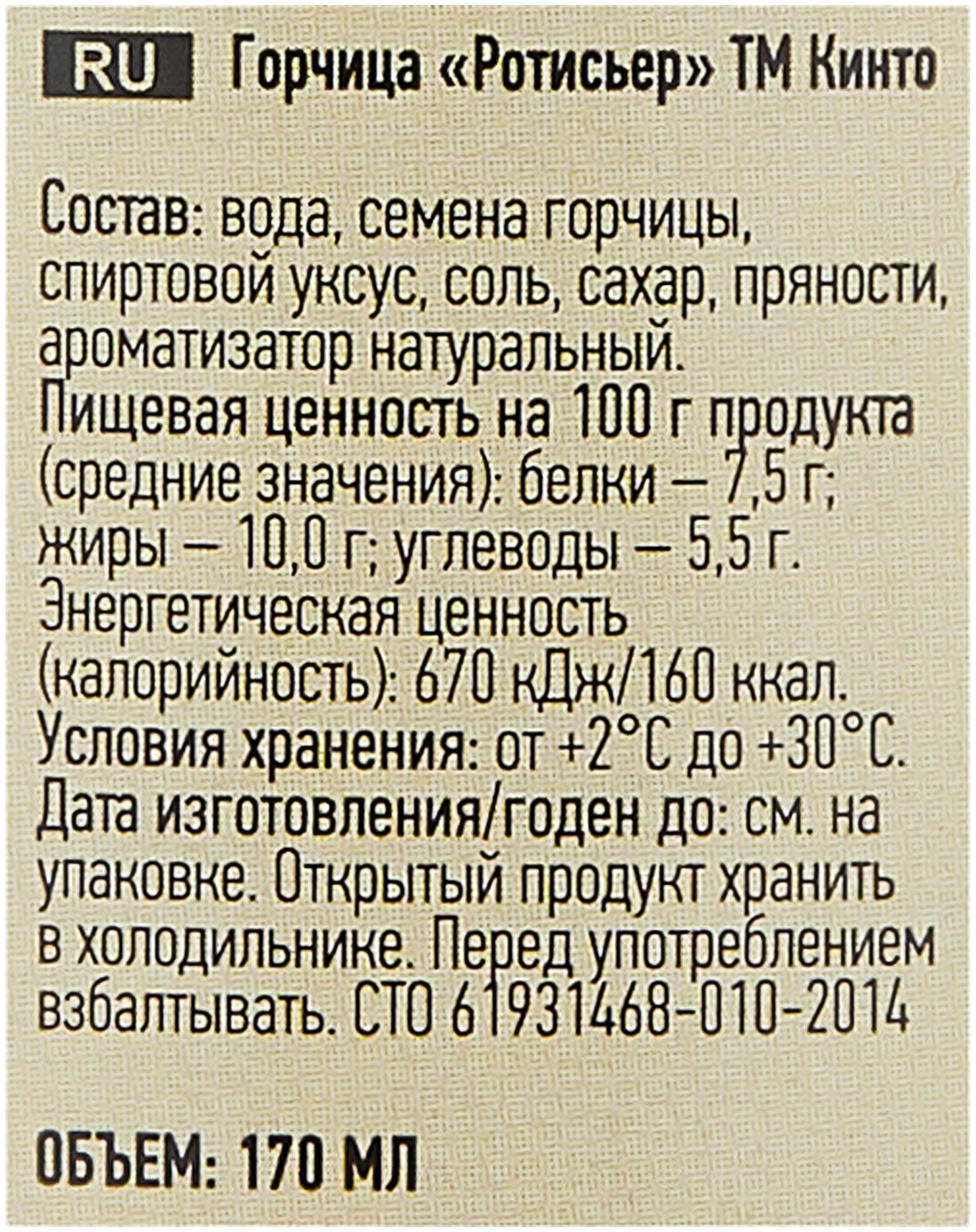 | Состав | Вода, семена горчицы, спиртовой уксус, соль, сахар, пряности, ароматизатор натуральный |